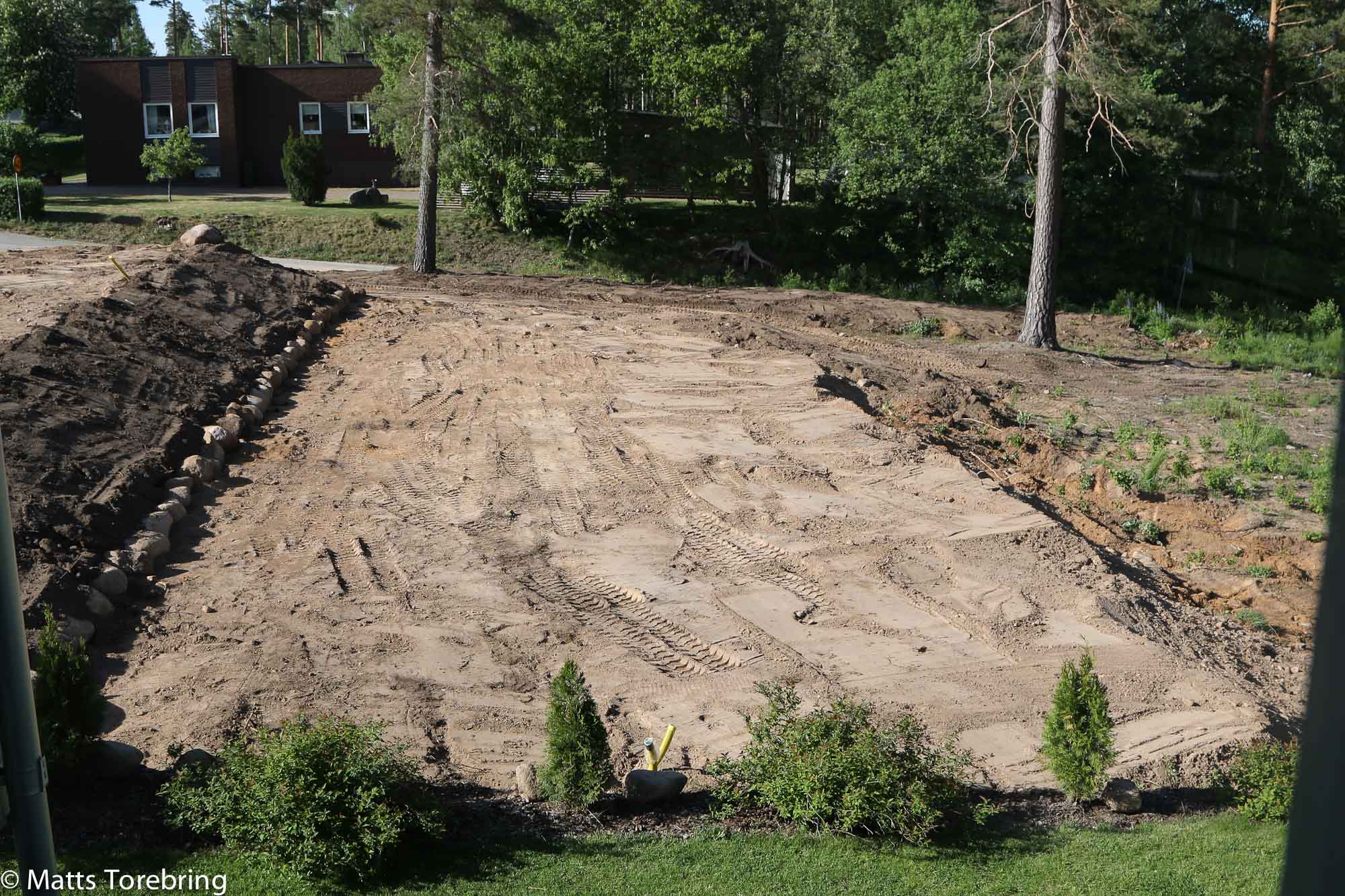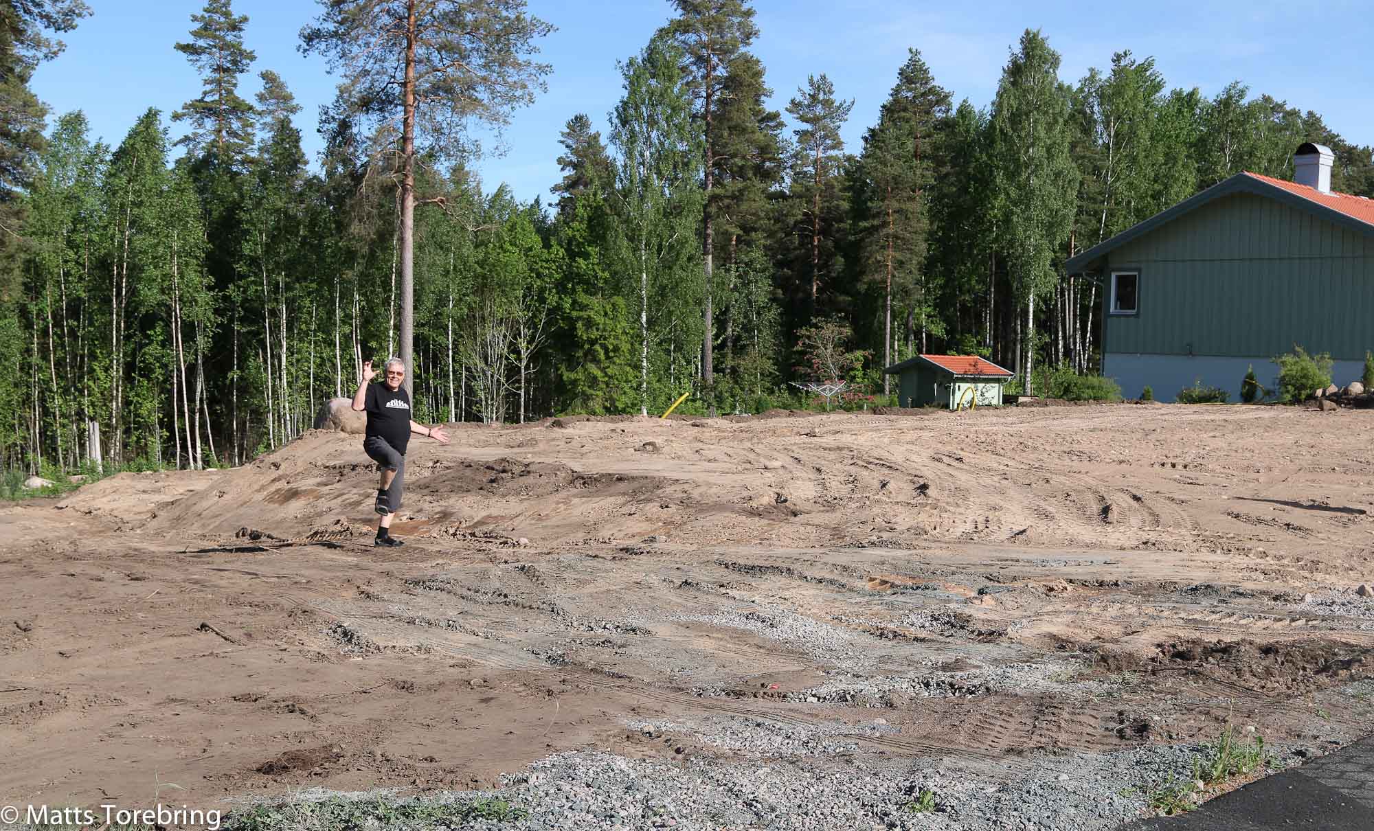 När jag lämnade Göran vid tio- tiden för att jobba ”på riktigt”, började han fylla upp slänten med 20 cm matjord. I slänten skall jag plantera marktäckande Stefanandra buskar. Till höger på planen i framkant, planerar jag för mitt garagebygge.
