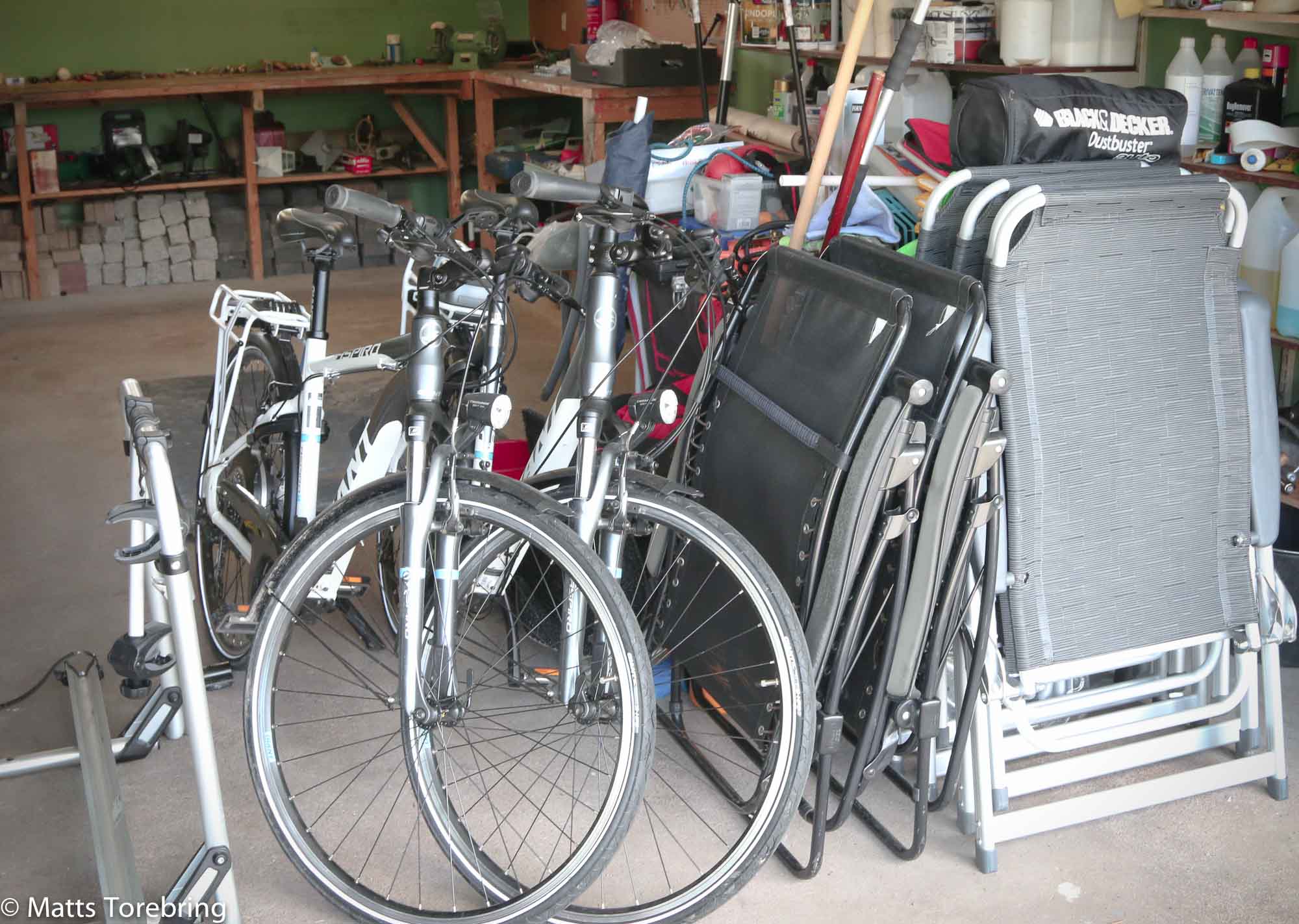 Cyklarna är pumpade, batterierna på laddning, allt är uppsorterat och färdigt att lasta. Detta är bara det lilla jag har i garaget. Birgitta har fyllt delar av, ett av våra gästrum med alla inneprylar. Sedan är det där med kläder. Normalt lastar vi med, för att klara säkert sju- åtta veckor utan att behöva tvätta. Det är därför vi valt den bil vi valt, med den planlösning som bara Kabe 910 QB och Concorde Carisma har.