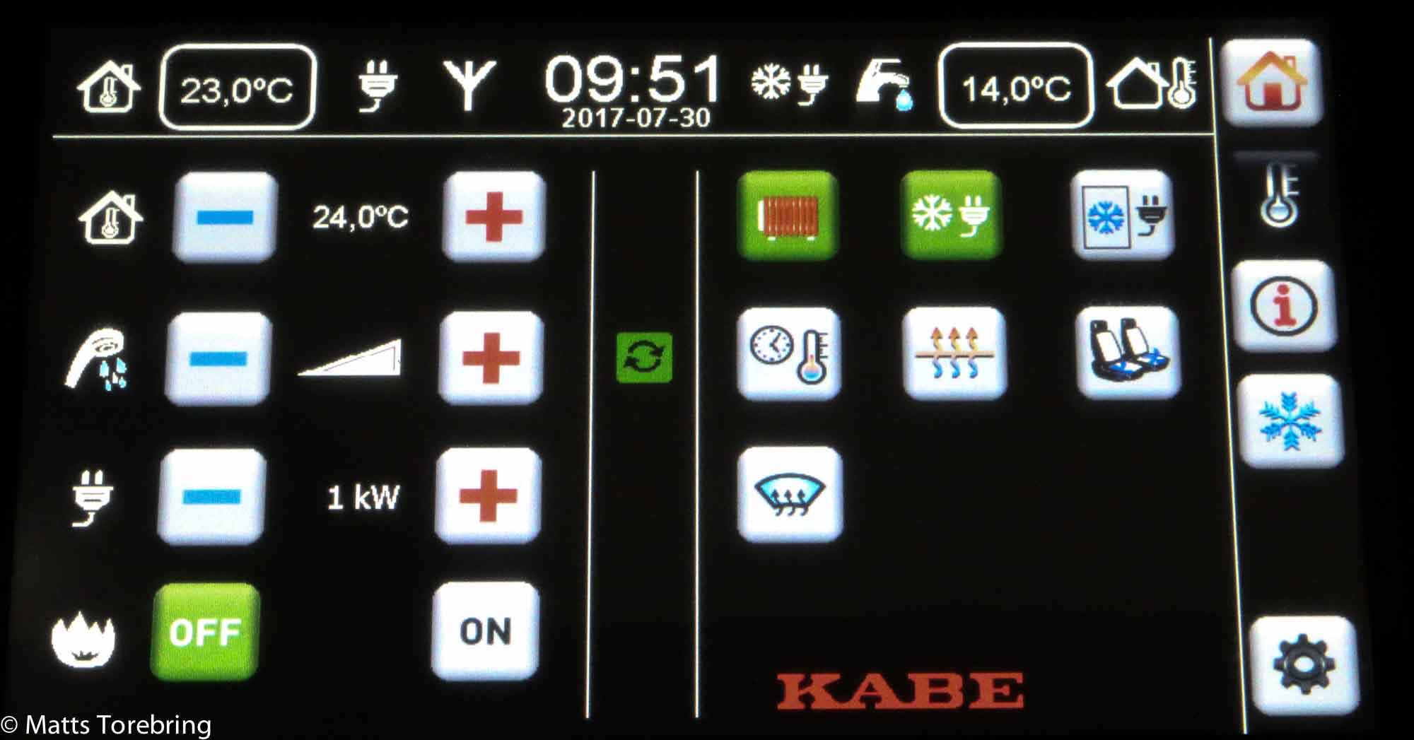 En av menyerna i vår styrpanel, visar 14 grader ute och 23 inne.