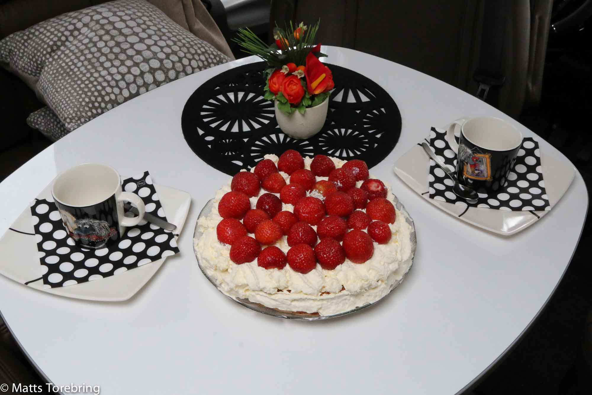 Jag läser, småskrattar och ler. Den liknelsen med hundvalpen och skokartongen, skall jag inte glömma. Kanske därför, jag också tycker, att vår qweensbed i husbilen är så skön, som är bara runt 1,5 meter bred. Våra sängar hemma (med 25 års garanti) är betydligt bredare. Gör en jordgubbstårta ni också, det är så gott. Nu har vi ätit upp den, på två personer och två fika stunder.Ha en extra skön helg.