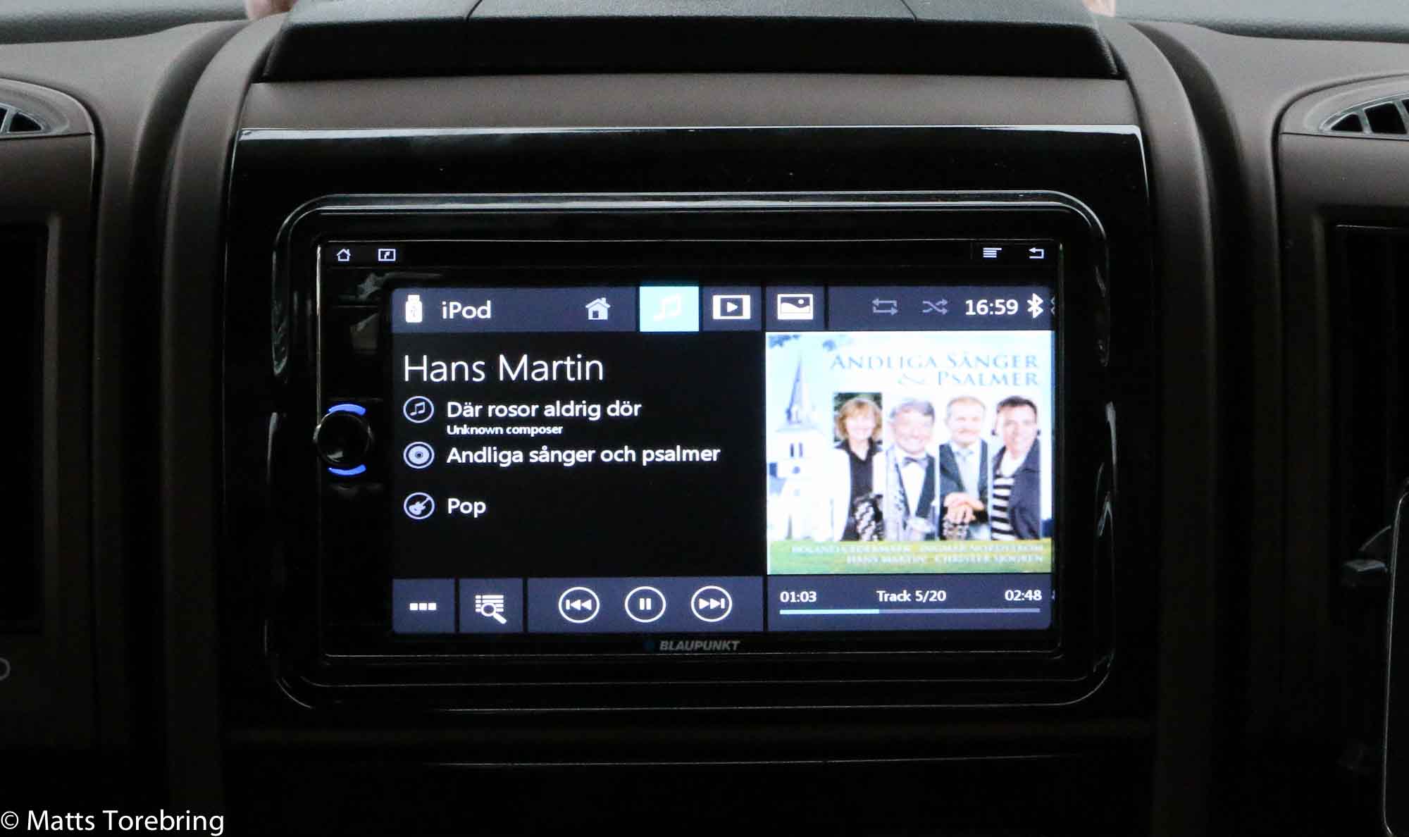 Vi testar oss in i Multimediasystemet, som vi har i vår nya Kabe. Det påminner om när jag körde Alfa Romeo 3.0 och hade häftiga slutsteg, monterade i bagaget. Nu sitter det under en av sofforna. Basen dunkar in i hela kroppen. Birgitta har 1002 låtar nedladdade i sin iPod, som vi bara kopplar till. Innan hade vi en hel väska med CD skivor. Det var nytt för oss, att även bilden på albumet, kom upp på displyen.