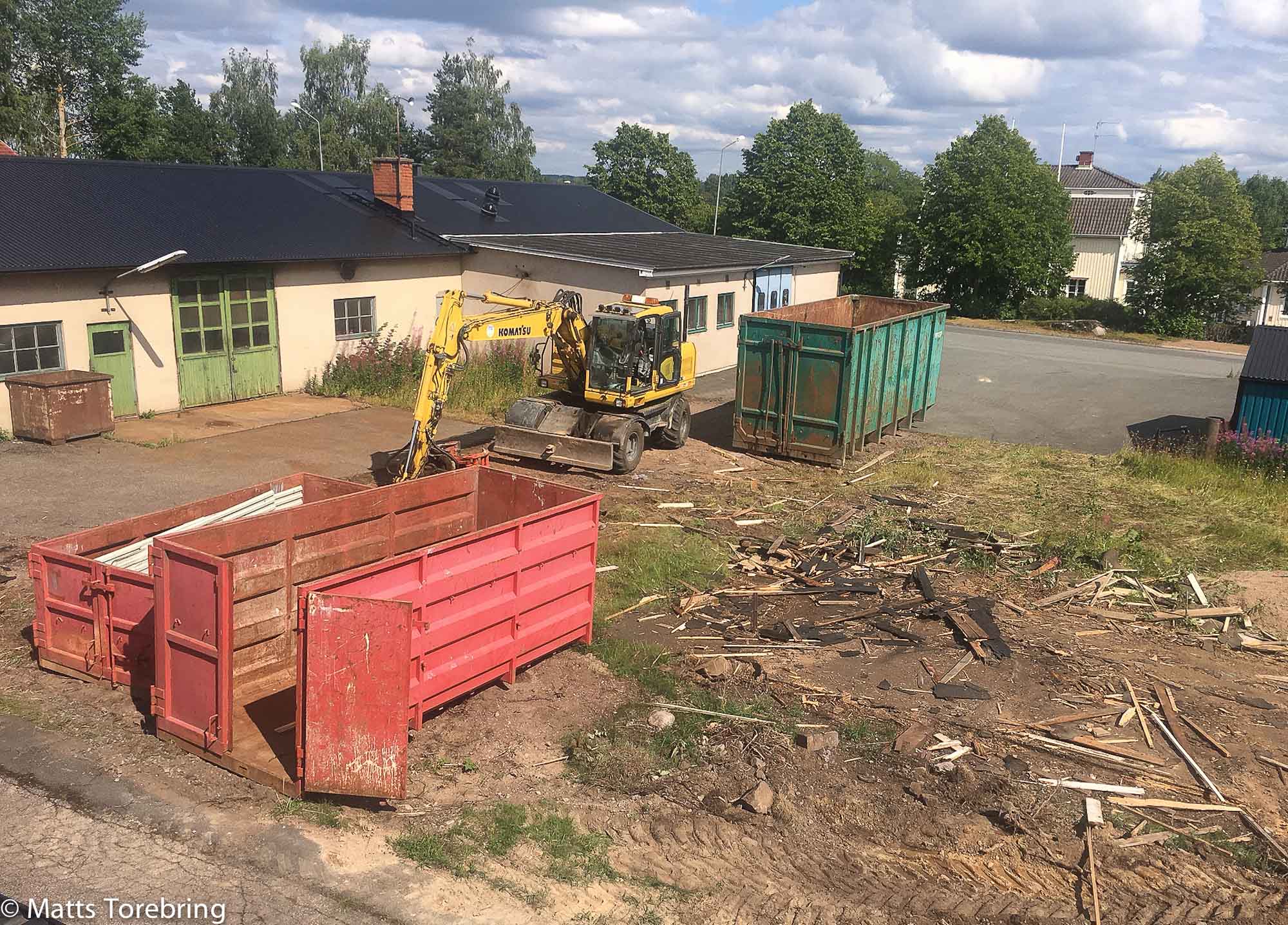 Det är tuffa dagar att jobba i juli månad, inte minst måndagar. Då händer precis allt. All inbokad personal behövs, ändå kom en sjukfrånvaro ”fem minuter i klockan sju” på morgonen. Ersättningspersonal, styra och möblera om dagen. Och så kom grävmaskinen och sa, ”Hur vill du ha det Matts”? Detta är första huset av fem, som vi kommer att riva. Lite kul att se plåttaket, vara nere på några minuter.