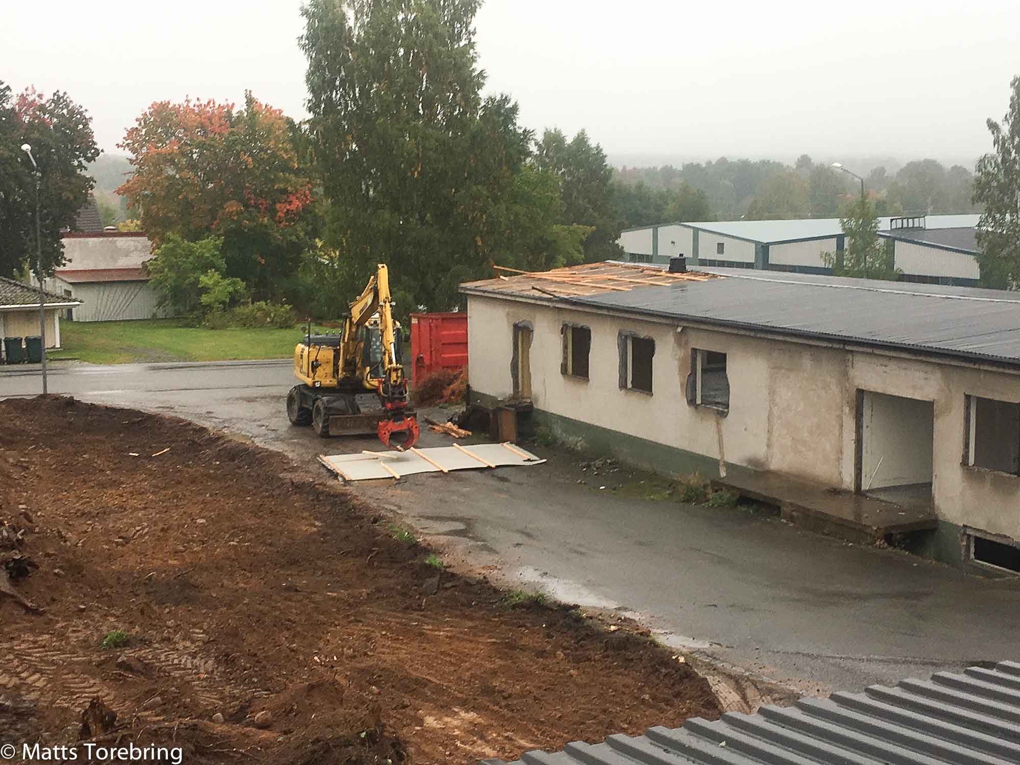 På den nedre bilden ser det ut som att du har missat att ta ner en tall. Med bra maskiner tycks det gå undan med att skapa snabba förändringar. Anar att det går åt många hydrauliska stödben samtidigt för att ska bli tillräcklig bärighet på den nylagda ytan. Förstår att det känns vemodigt att behöva riva en byggnad som var med från början.