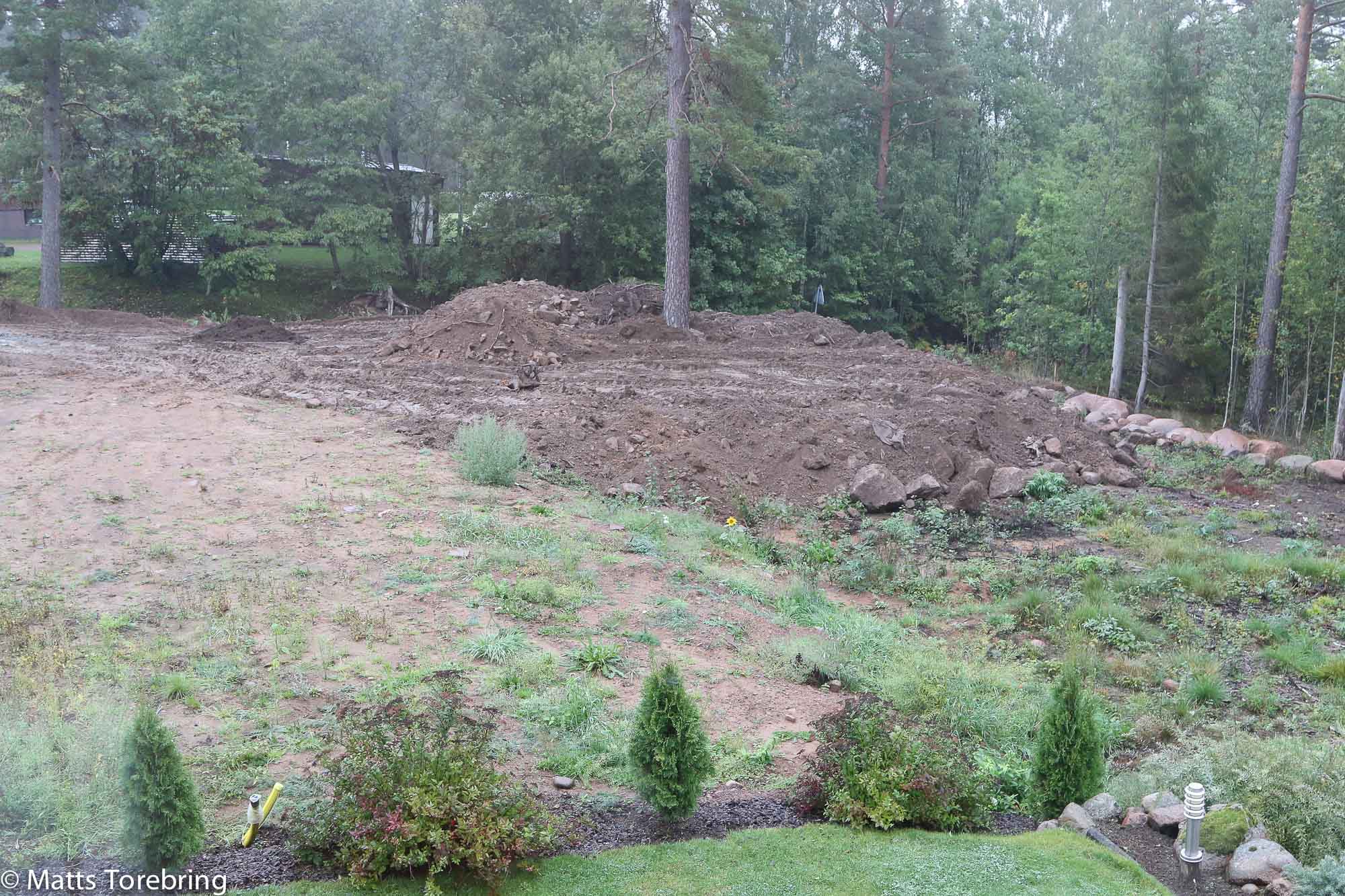 Nu när jag får så enorma mängder med bra schaktmassor, har jag helt tänkt om. Jag gör bara två etage i vår ”trädgård” och fyller ut till plan mark. Nu blir det bara en hög slänt ned mot skogen. Till vänster i bild bygger jag vårt husbilsgarage, med en hård yta framför. Mot skogen blir det en gräsplan.
