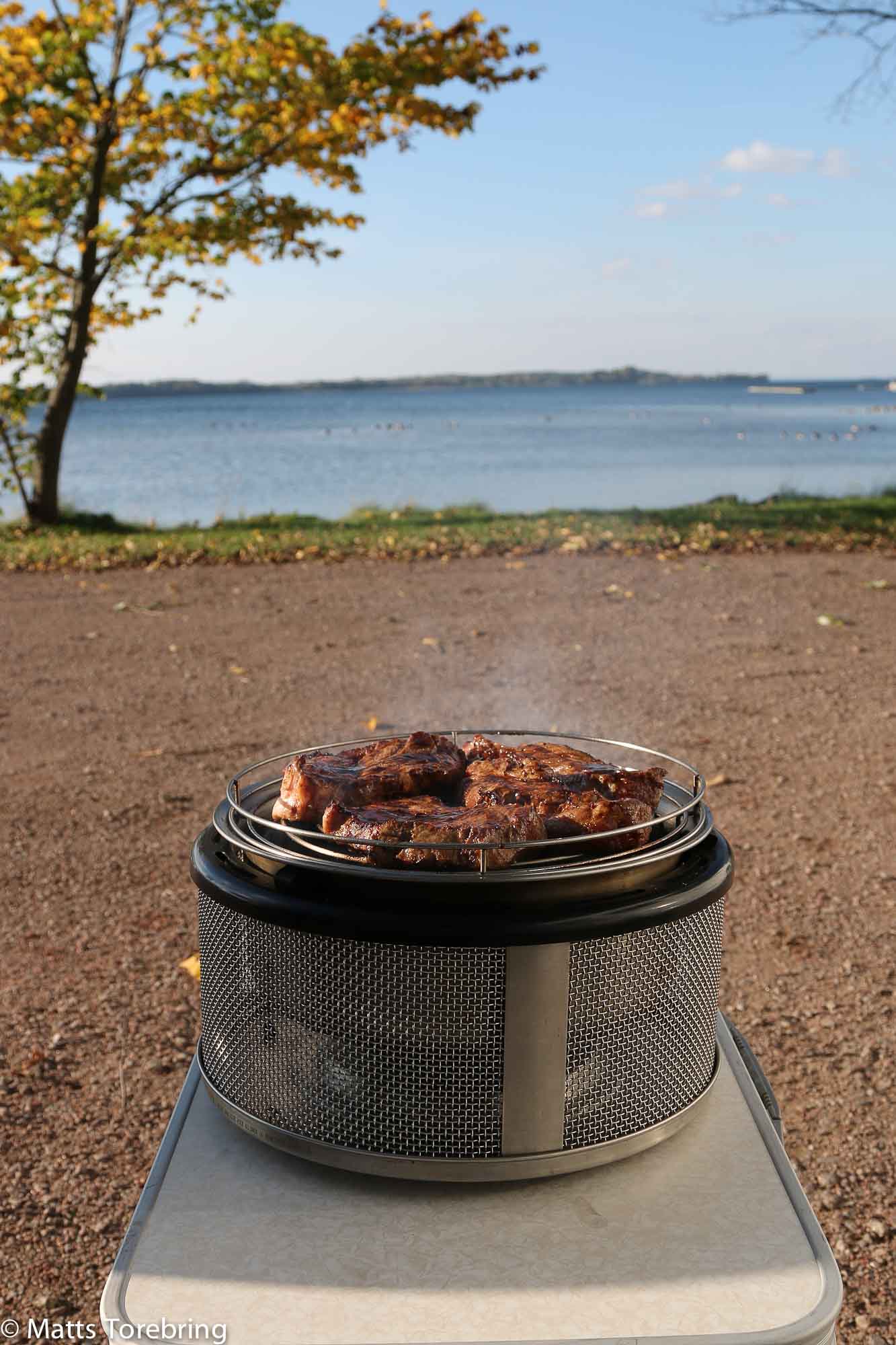 Det blev lite väl blåsigt fram på eftermiddagen, men grilla det gjorde vi. När vi kan parkera i strandlinjen är det toppen. Längre in på gräs/grusytan är det felplanerat och bilarna står alldeles för tätt.