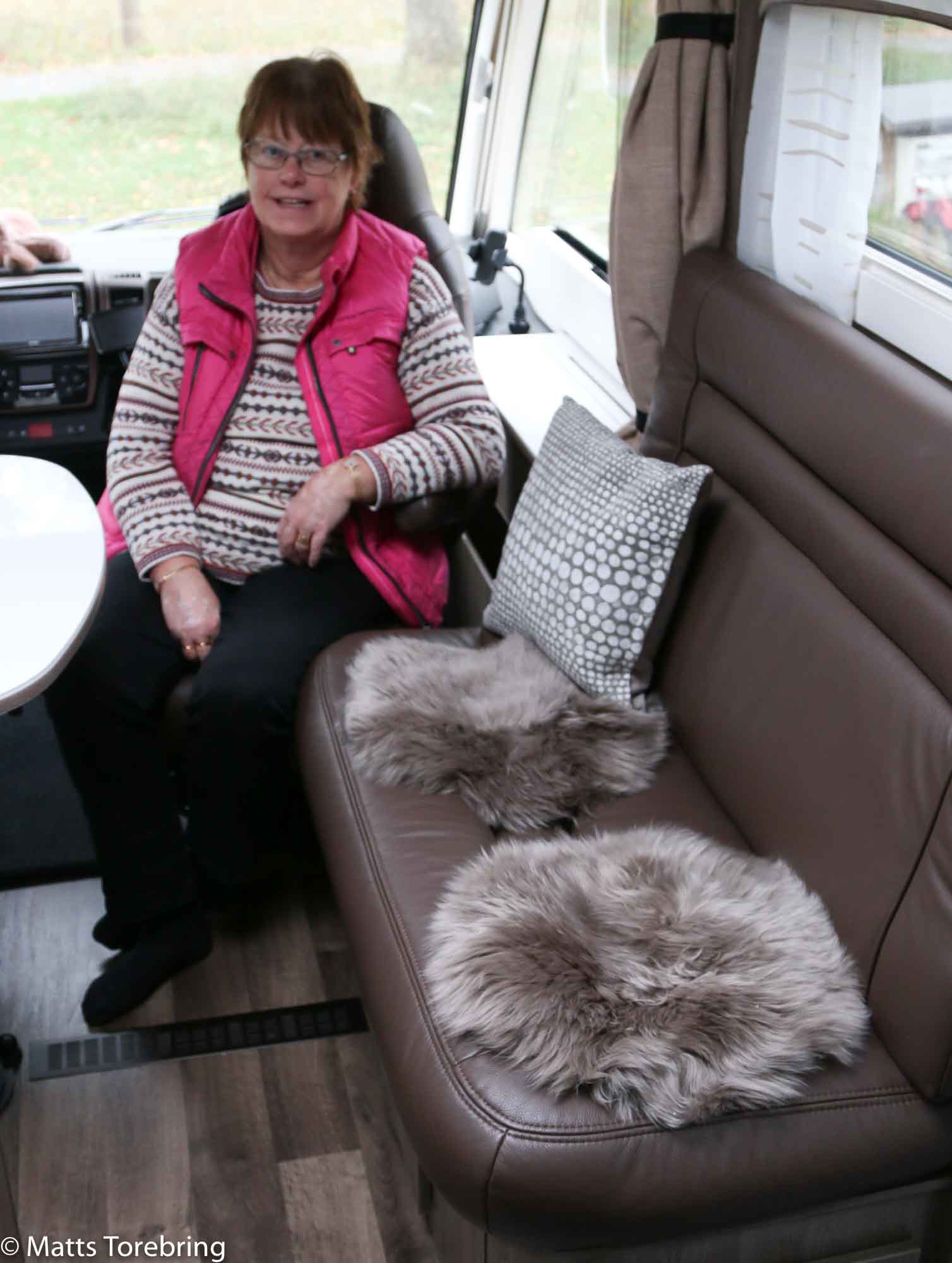 Vi har inte velat ha fårskinn till vår bil, vi tycker det är renare och snyggare utan. Men nu när kylan kommer, måste vi ha något värmande att sitta på. Stolarna i cockpit är eluppvärmda men inte sofforna. Detta blev vi riktigt nöjda med.