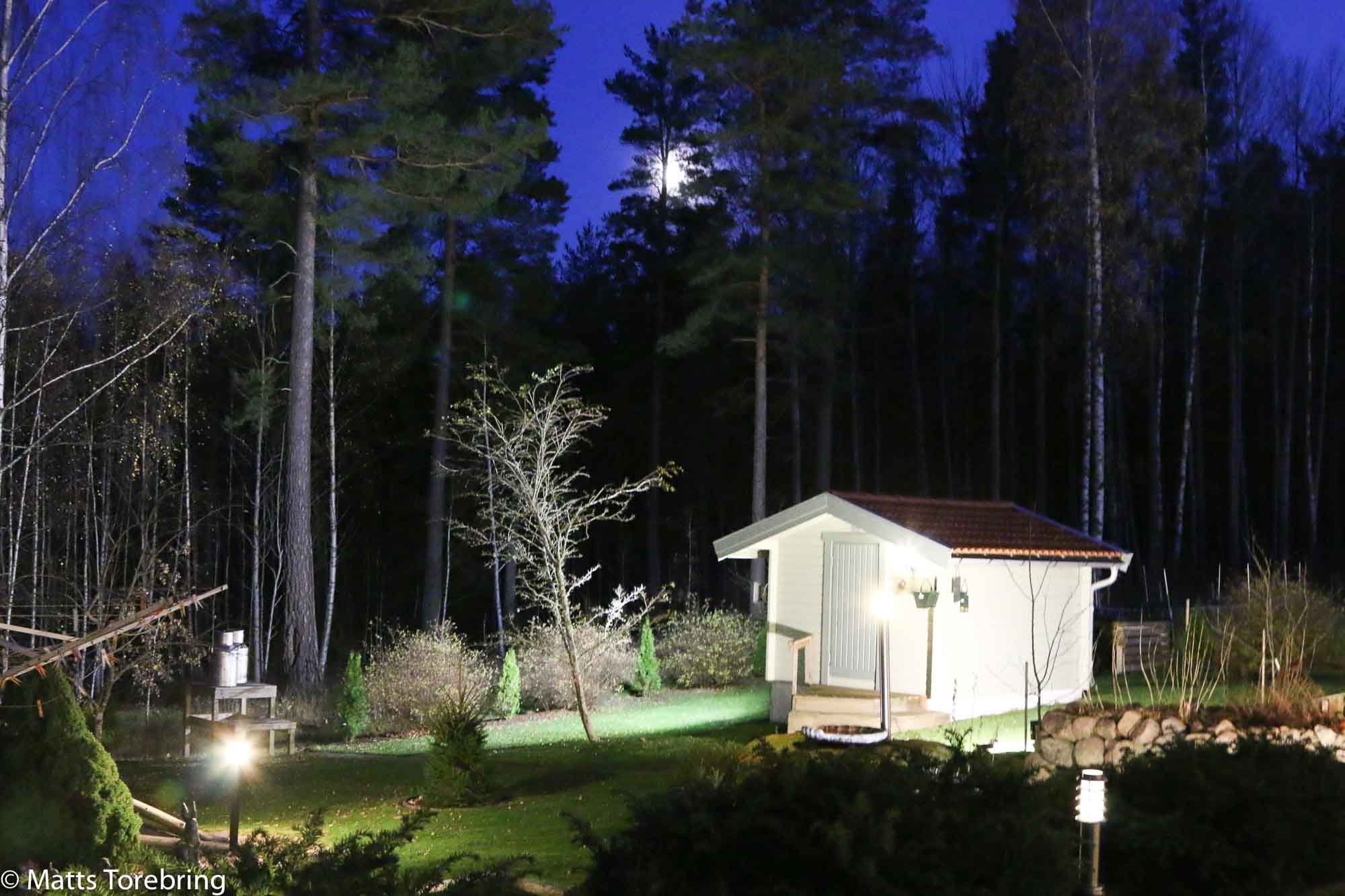 Vi som har stora skogen till närmsta granne på baksidan, måste göra allt vi kan, för att hjälpa månen att lysa upp. Så sagt och gjort, flera strälkastare kom upp. Jag har två till att sätta upp i nya ”Trädgården”, så snart jag schaktat färdigt för i år. Jag är inte speciellt förtjust i vintertiden och de mörka kvällarna som börjar nu.