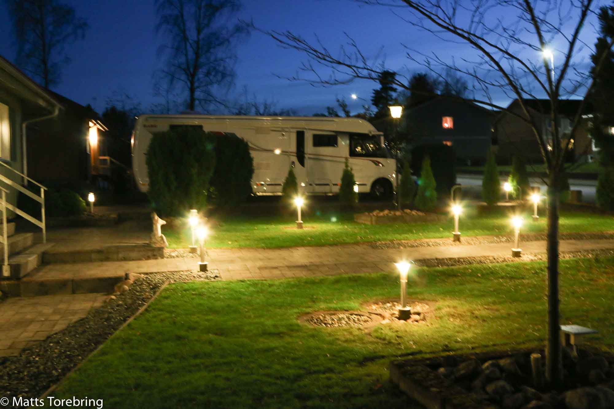 Ljus i trädgården ja jag ha belyst huset. Tänder med er skymningsrelä är så bra man sliper ställa om klockor. Tänder även en lykta med var kväll på framsidan.