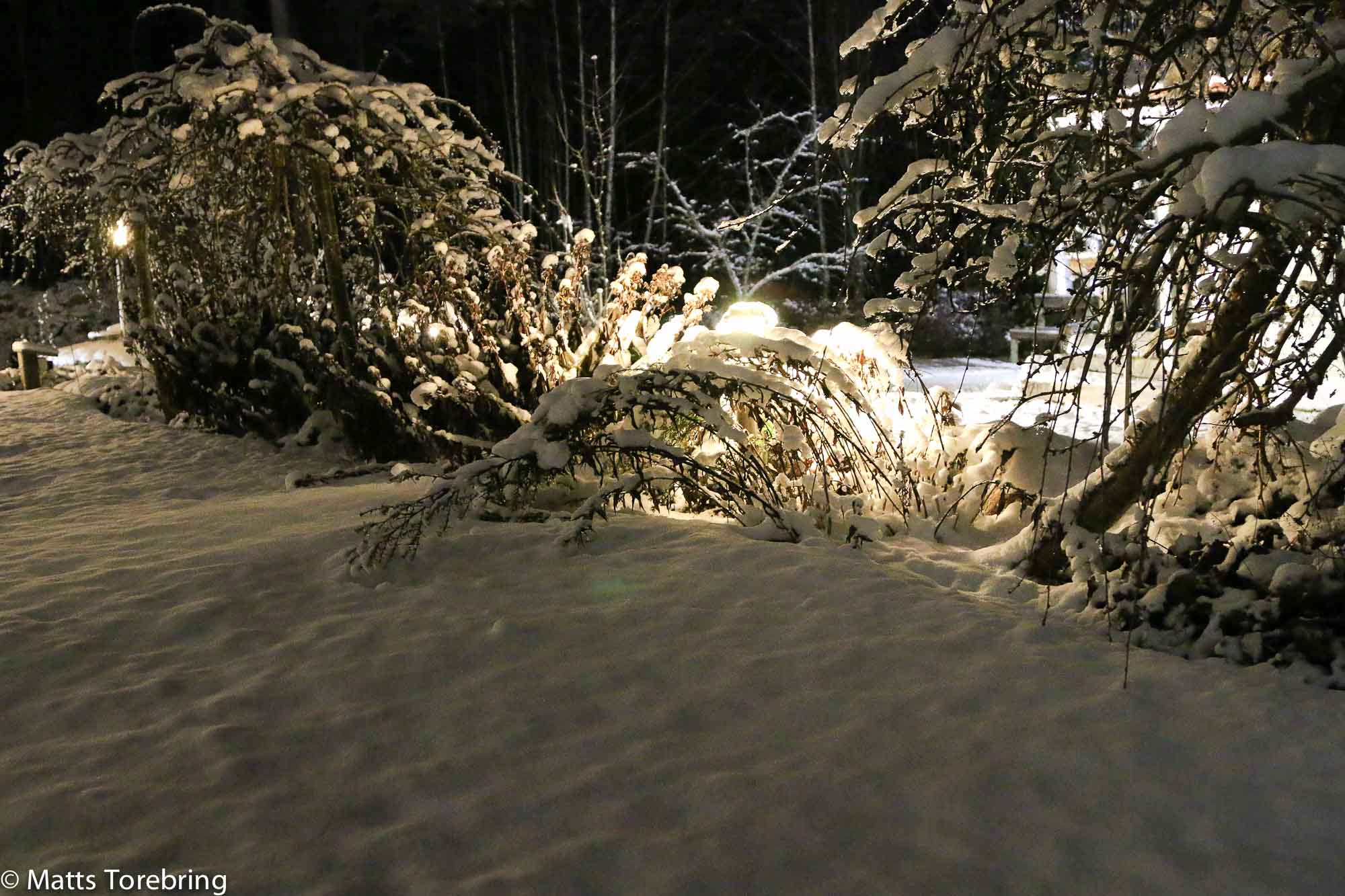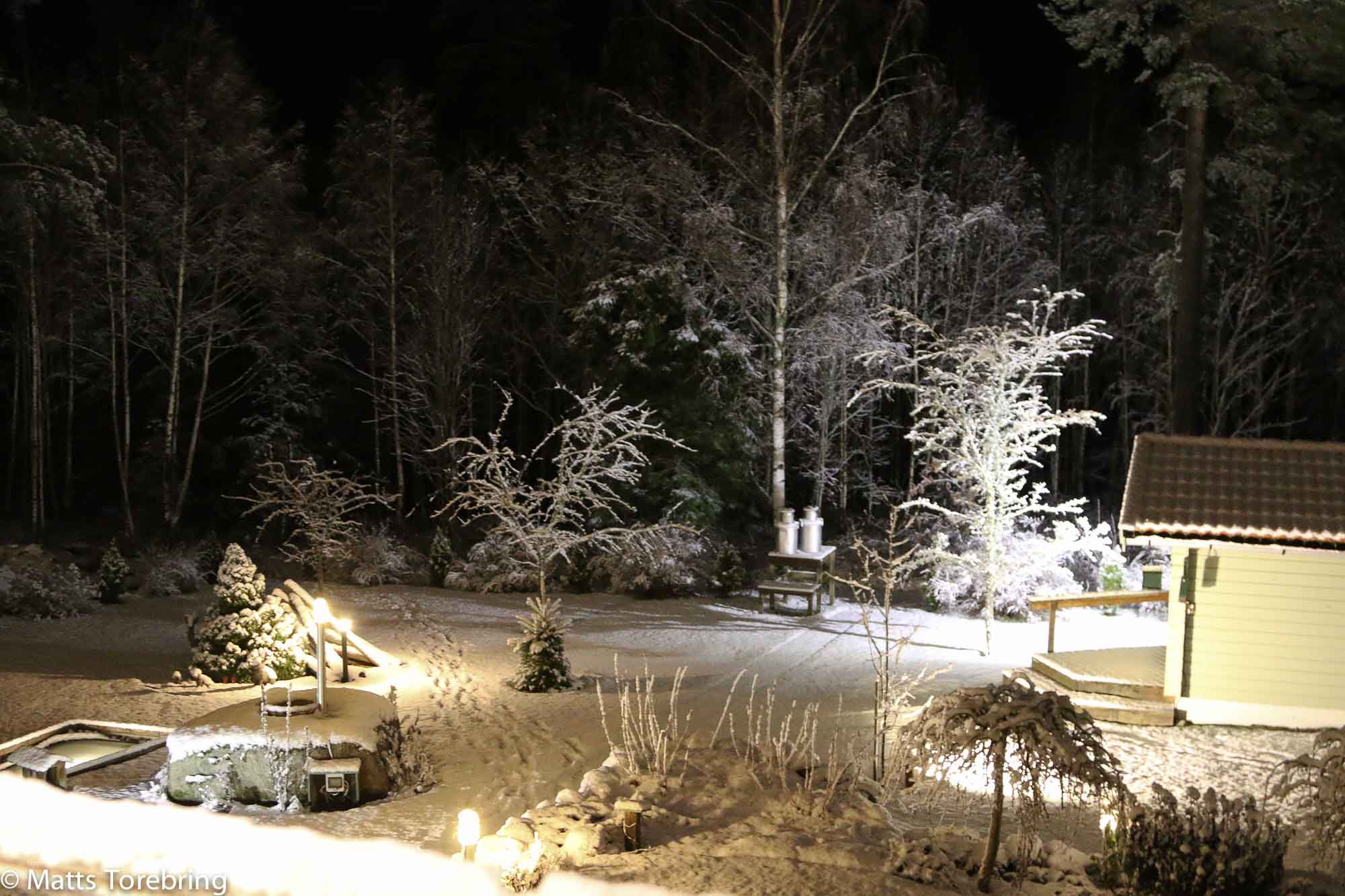 Första riktiga vinterbilden denna vintern. Vi är så lite hemma, att jag har inte hunnit få upp, ett par strålkastare till mot skogen, som ligger i garaget och väntar. Men lite lyser det upp i alla fall. Bara se mörkret på baksidan mot skogen vore hemskt.