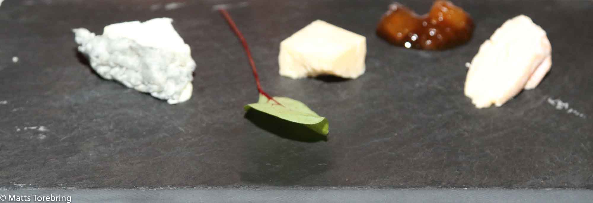 Tre ostar på stenskiva, tillsammans med husets egna päronmarmelad