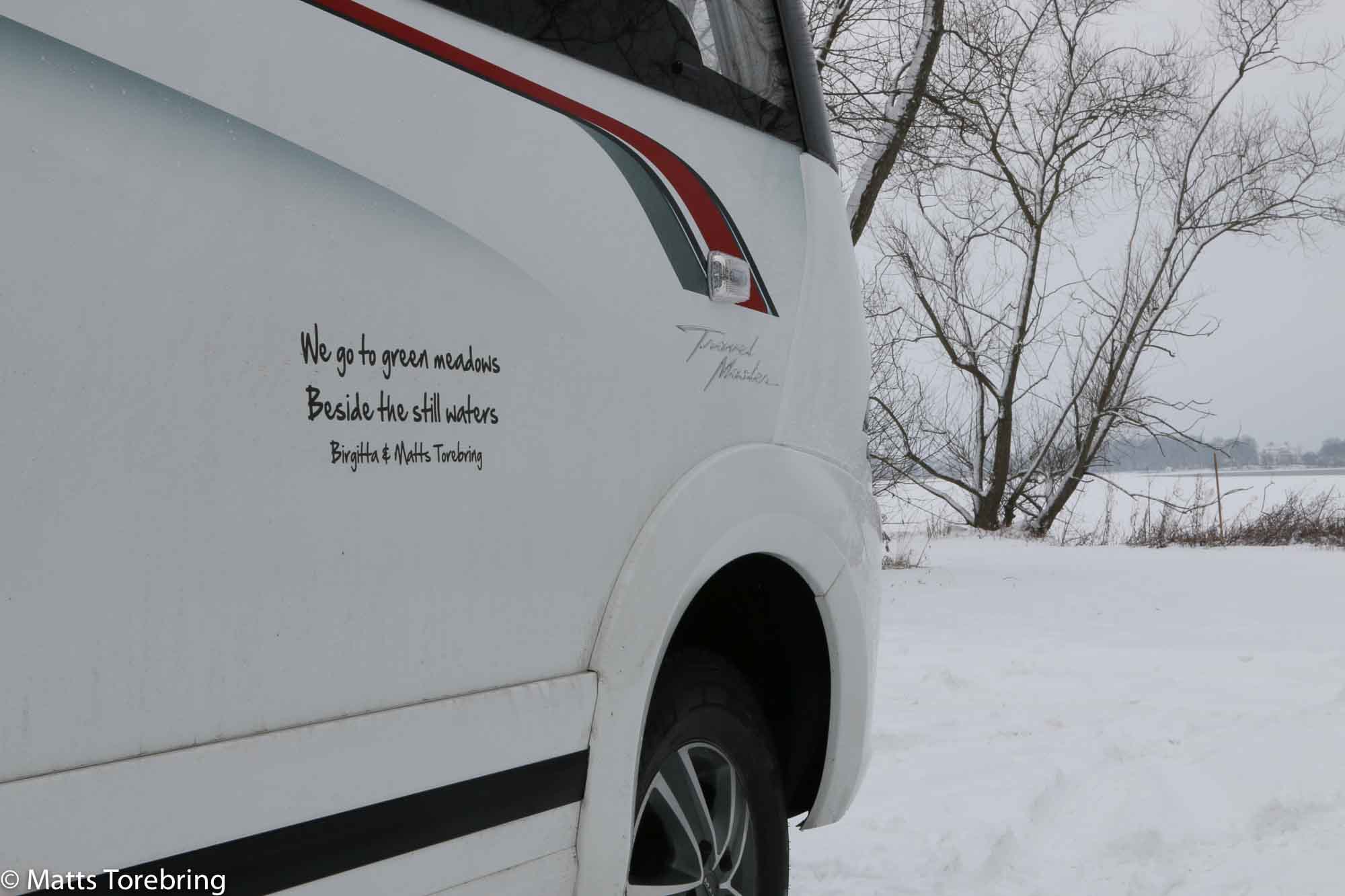 Idag var det skönt med riktiga vinterdäck på bilen. Nu tuggade det bara på i snön, utan minsta problem. Det är faktiskt första gången, vi gästar vår favoritplats i Vadstena, under så snöiga förhållanden. Kanske är det inte ställplatsen som sådan, som lockar oss hit. Det är Östenssons goda mat och ett café på stan.