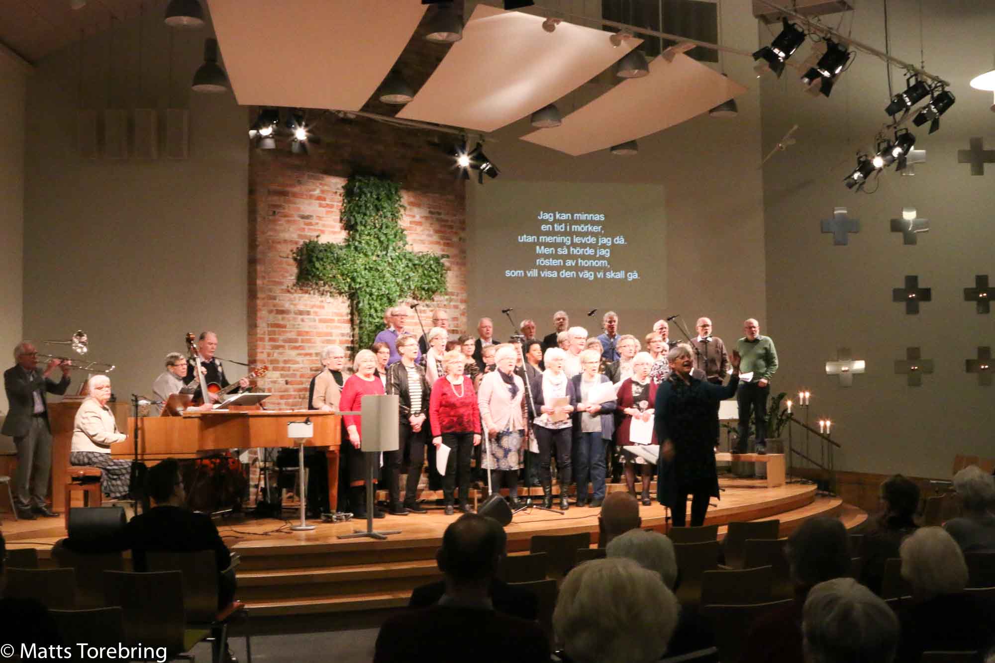 En samlad kör från Pingstkyrkan Vetlanda och Tranås, sjöng otaliga av de gamla kända läsarsångerna. Vi kände igen flera personer som medverkade, trots att det gått 50 år nu. Lite tragiskt att så få, unga familjer fanns med. Kanske var de hemma för ”Mellon” på tv.