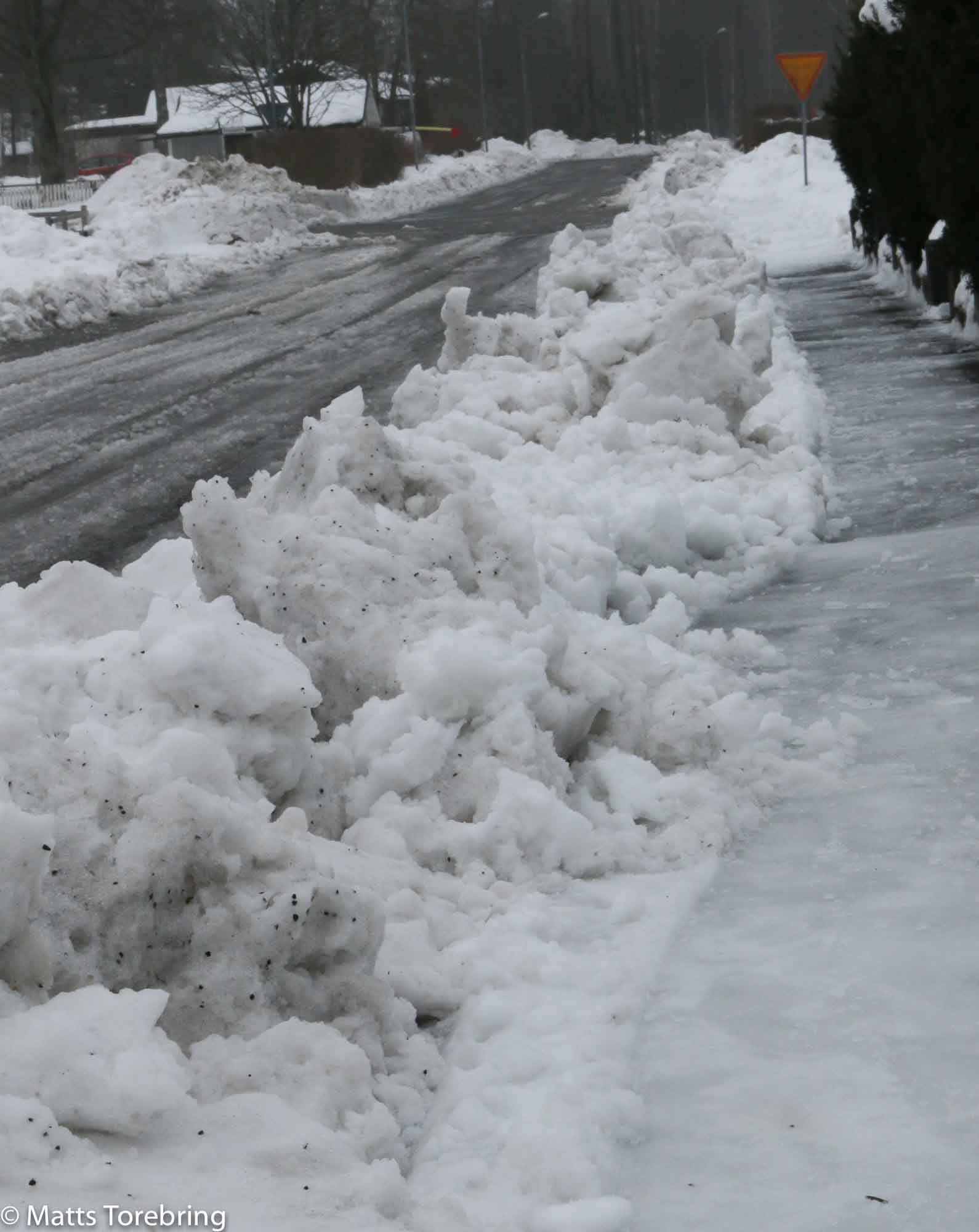 Vår lilla del av den långa Skogsgatan hemma, har de plöjt bara en enda gång tidigare i år, trots allt snöande. I dag kom de och plöjde undan all sörja. Jag sköt in snösläden, men gav upp, det var tyngre än bly och ingenstans att lägga det. Jag hade brutit sönder snösläden också, om jag fortsatt.