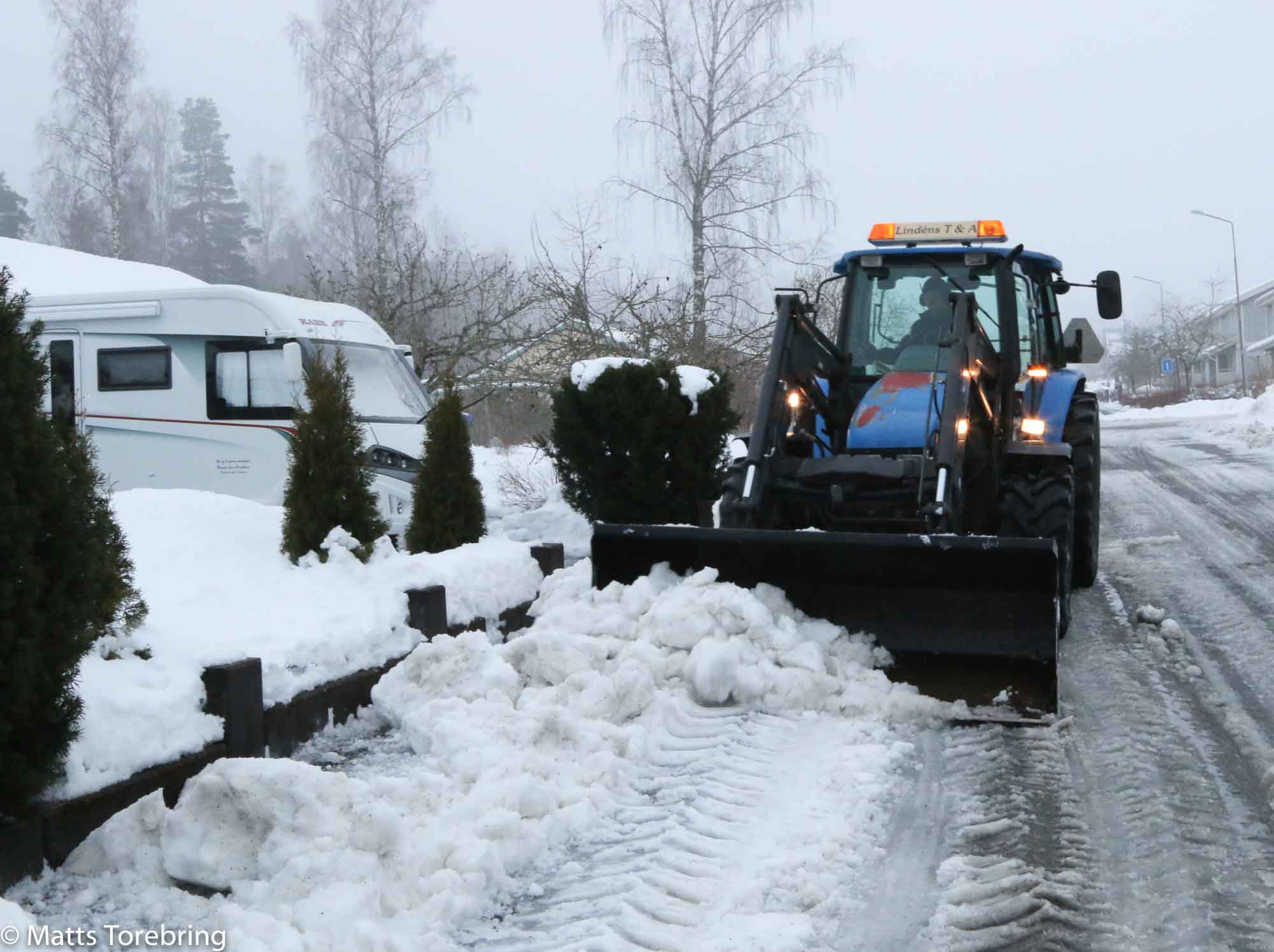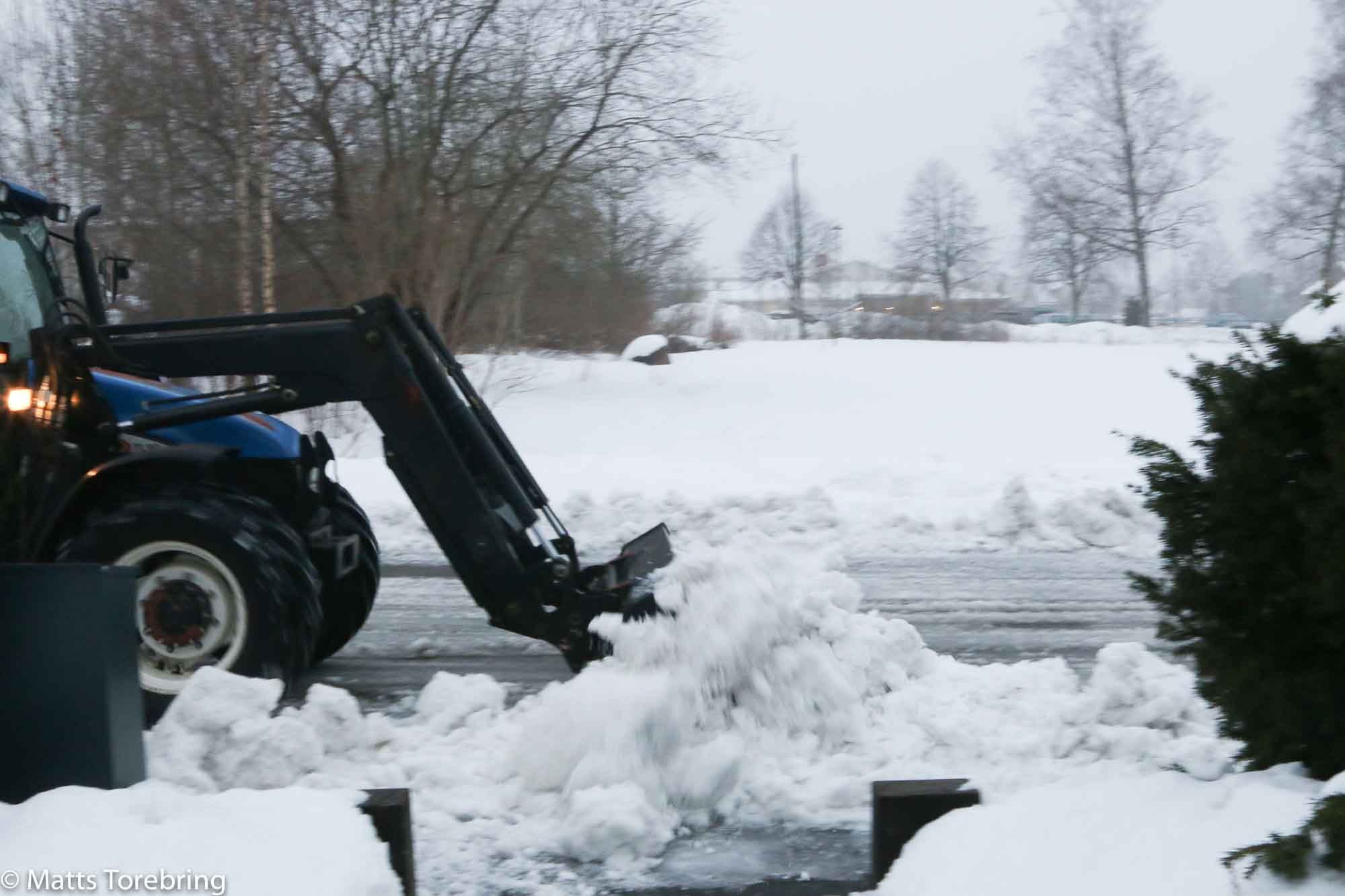 I detta läget är det bra att ha en traktor som hjälp. Blytung snö och sedan om det blir kallt då är det tungt.