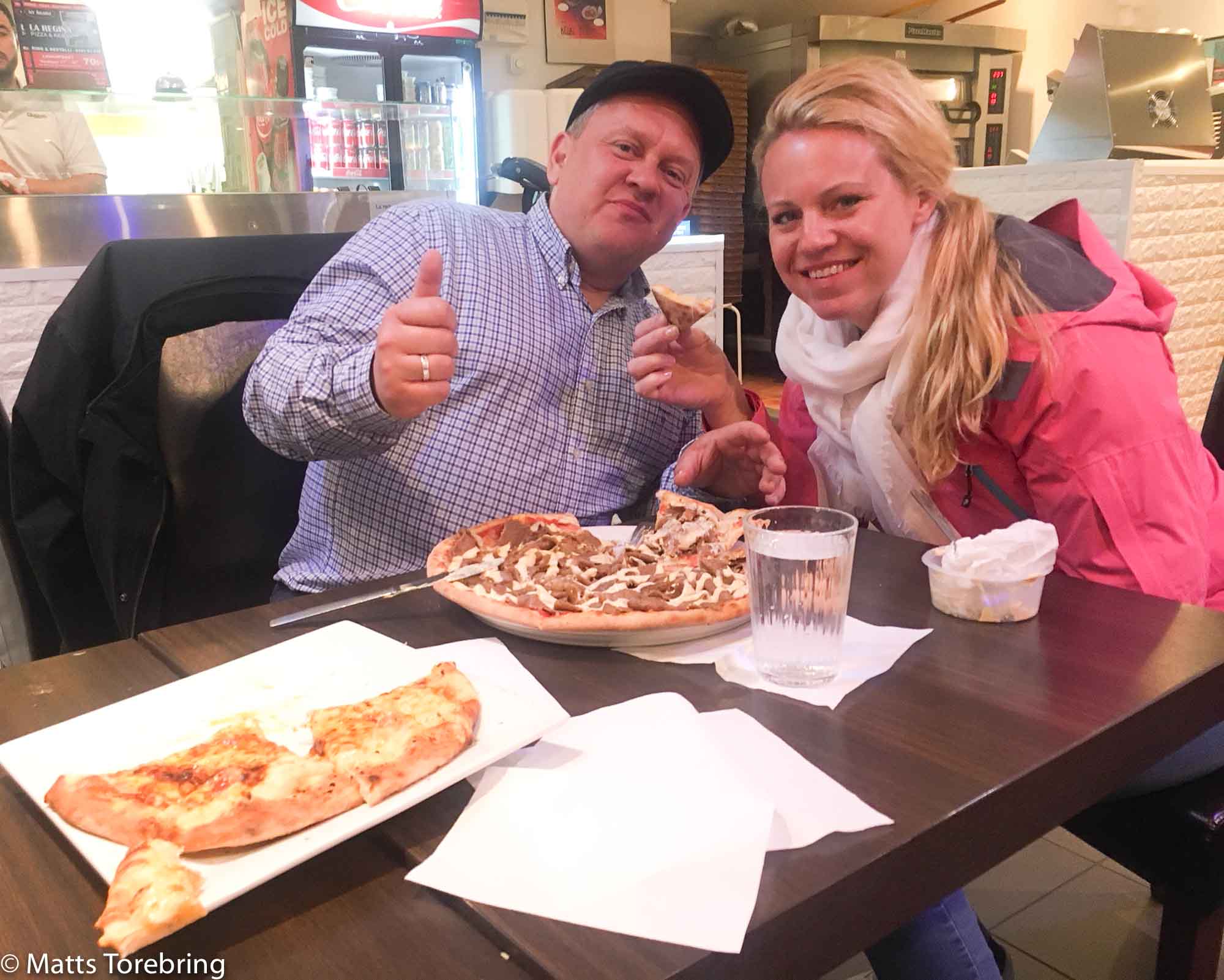 Pizzabagaren tyckte vi var så trevliga, att han ville bjuda oss alla sex på pizza. Det fick han inte och vi andra orkade inte heller. Anna blev till slut tvungen att hjälpa Henrik med sin jättepizza.