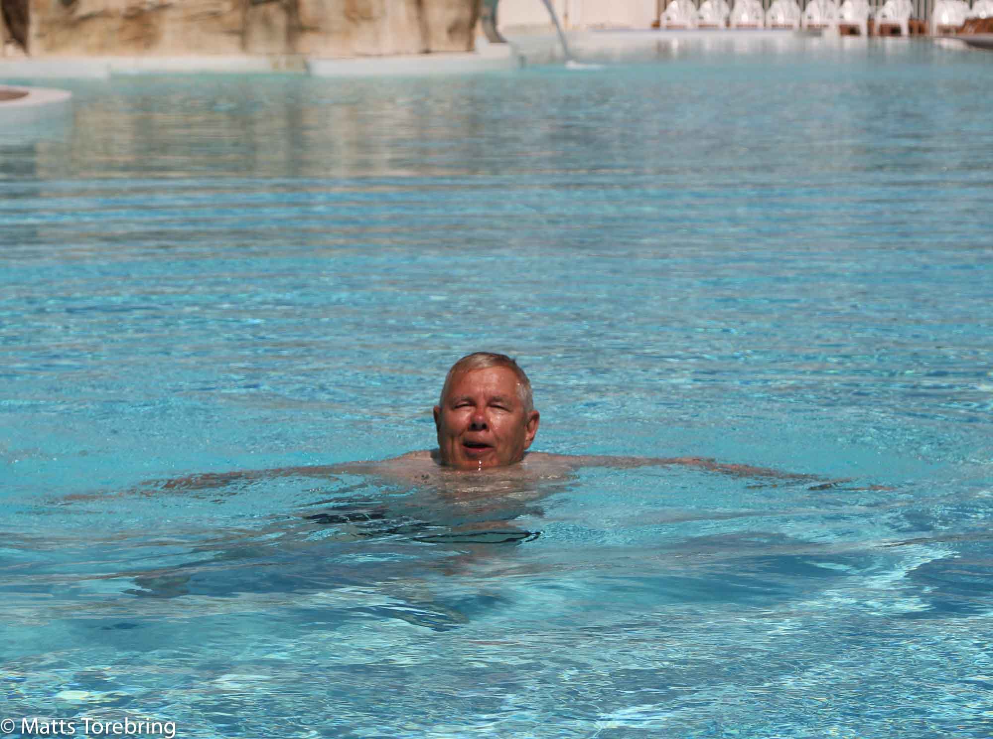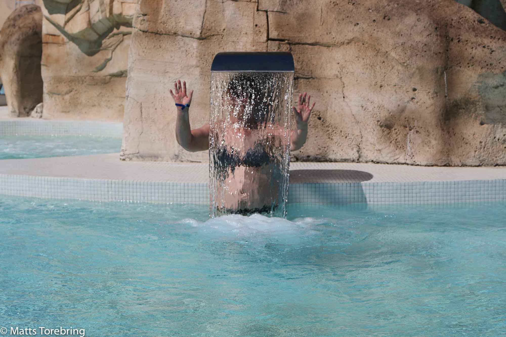 Vattenlandskapet består av flera olika bassänger, vattenlek och bubbelbad. Denna hade lite kallare vatten, men var jättelång, skön att sträcka ut och simma i. Så underbart skönt, så länge det är så få här och badar. Ett vattenlandskap som detta, tilltalar även Matts.