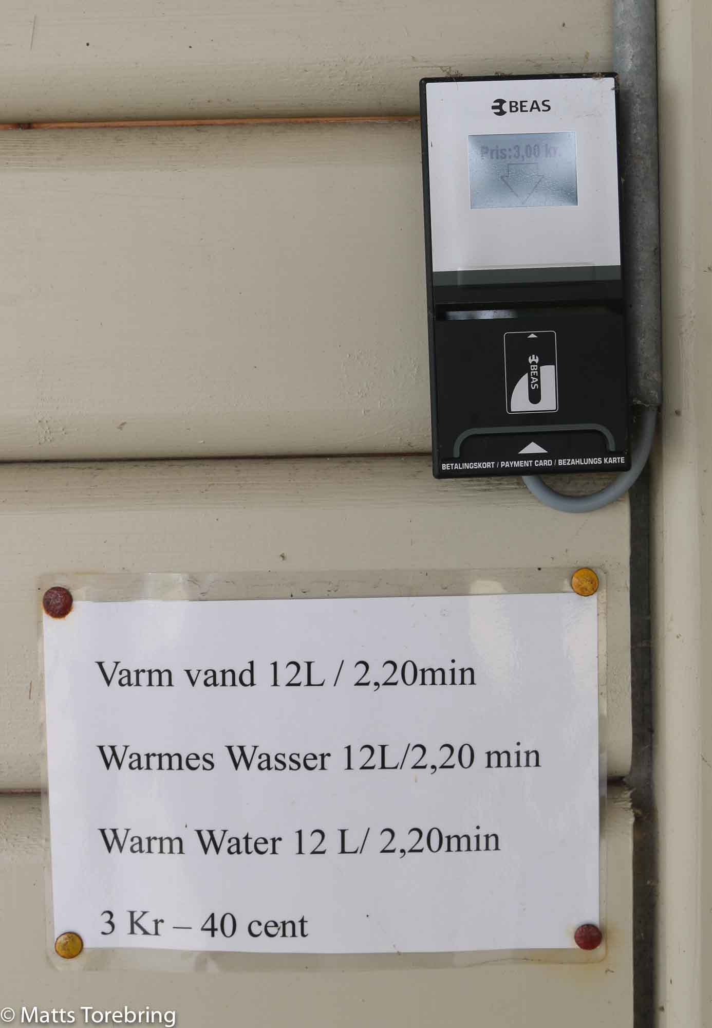 Stoppa in ditt servicekort, som du laddat upp pengar på, i en kortläsare. För 3 DKR får du 12 liter vatten. Så snart du öppnar kranen, tickar sekunderna ned. Efter 2,20 minuter slutar vattnet att rinna. (En dansk krona är lika med cirka 1.40 SEK).