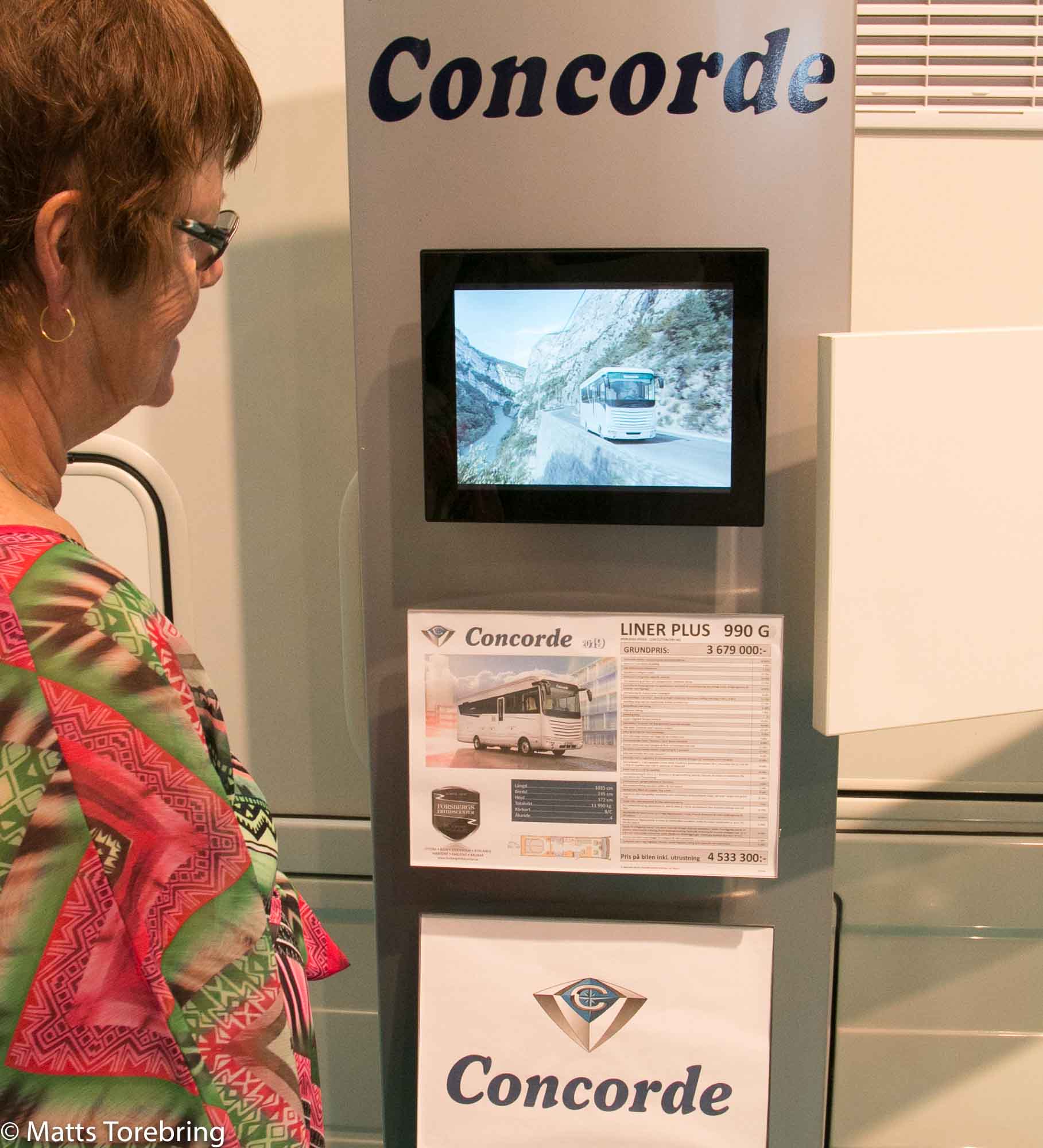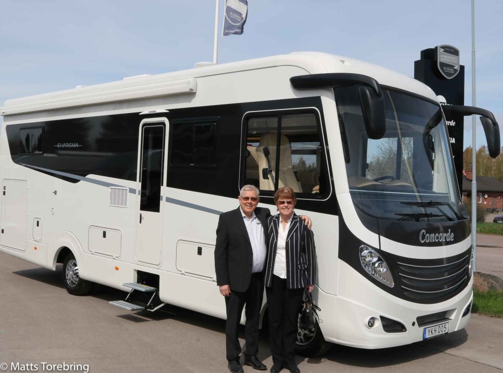 Naturligtvis studerade vi Concorde Liner 990 G. Planlösningen inne, är rena önskedrömmen, med massor av garderober. Bilen är 900 mm längre än vår. Den har garage för en liten bil, det vill vi inte ha. Den väger 12 000 kg, det vill vi heller inte ha. Kan vi kalla det att bilen står så långt ut på högerkanten som det bara går?