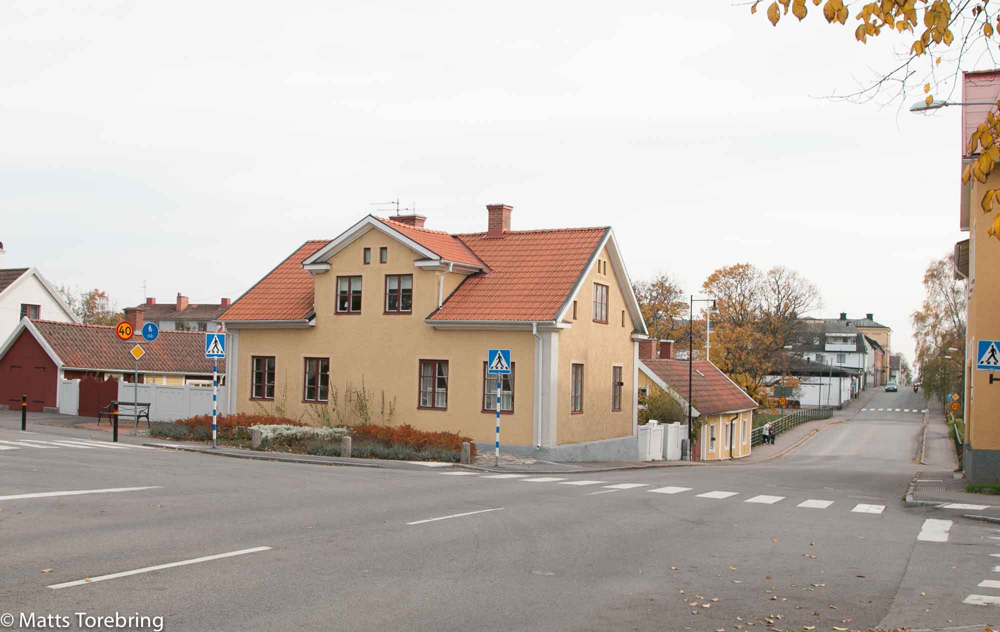 Här gick riksväg 50, från uppe vid torget längst bort i bild, och så rundade jag alltid gula huset på vägen mot Motala. Rakt fram gick vägen till Vadstena.