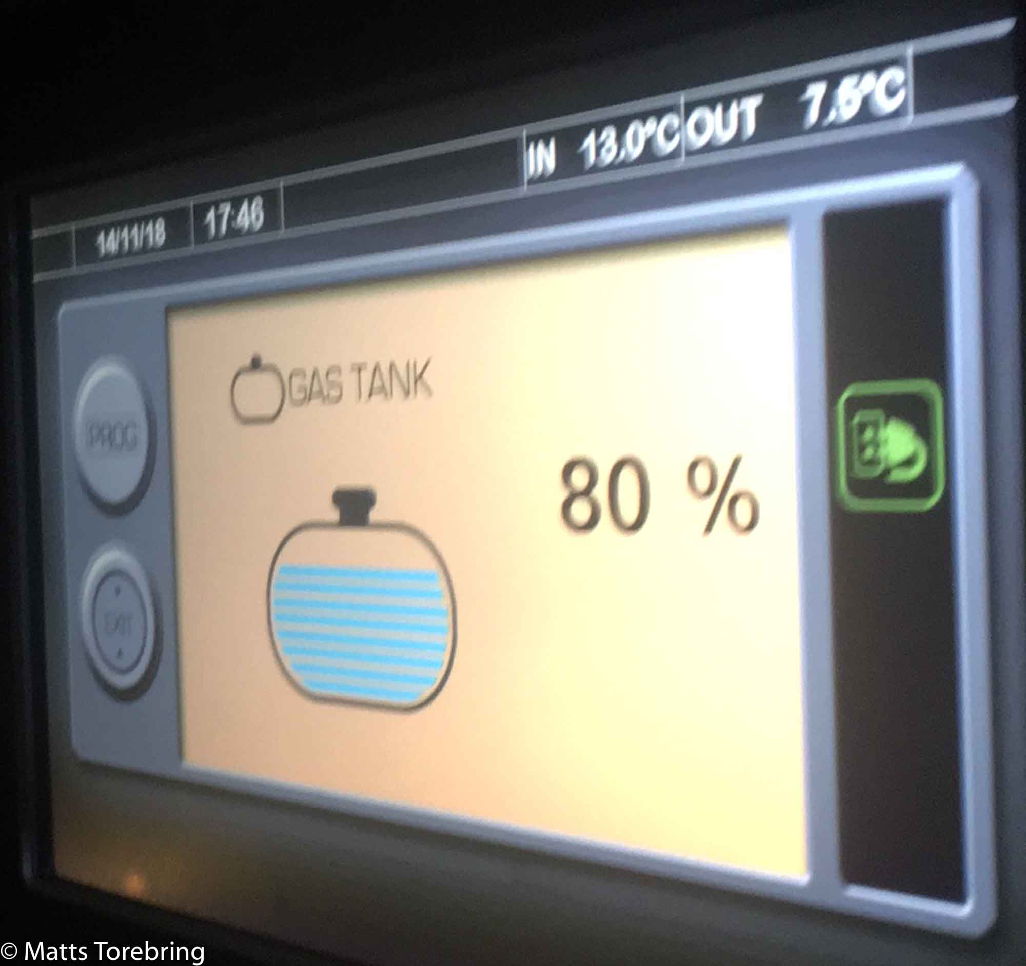 Vi tankade full tank 6 juni, vi testfyllde i början av sept, då gick det i 15 liter. I dag har vi givare monterat i displayen, vi har 80 % kvar, trots att vi fricampat helg efter helg, utan el och haft + 24 grader varmt i bussen och värme överallt på golvet och inte bara fläckvis som vi haft tidigare husbil.