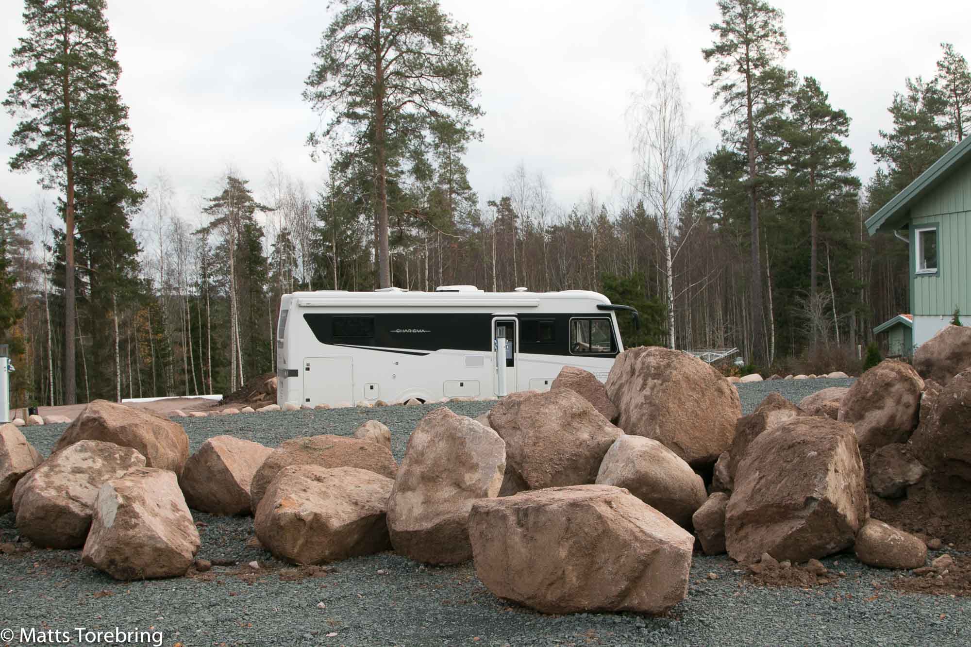 Hur har vi kunnat leva med att ha husbussen bredvid garageinfarten under snart 20 år? Så trångt att backa ut lillbilen, besvärligt att skotta snö och så trångt att det knappast gått att gå rent bilen. Här har HERDEN fantastiskt gott om utrymme.