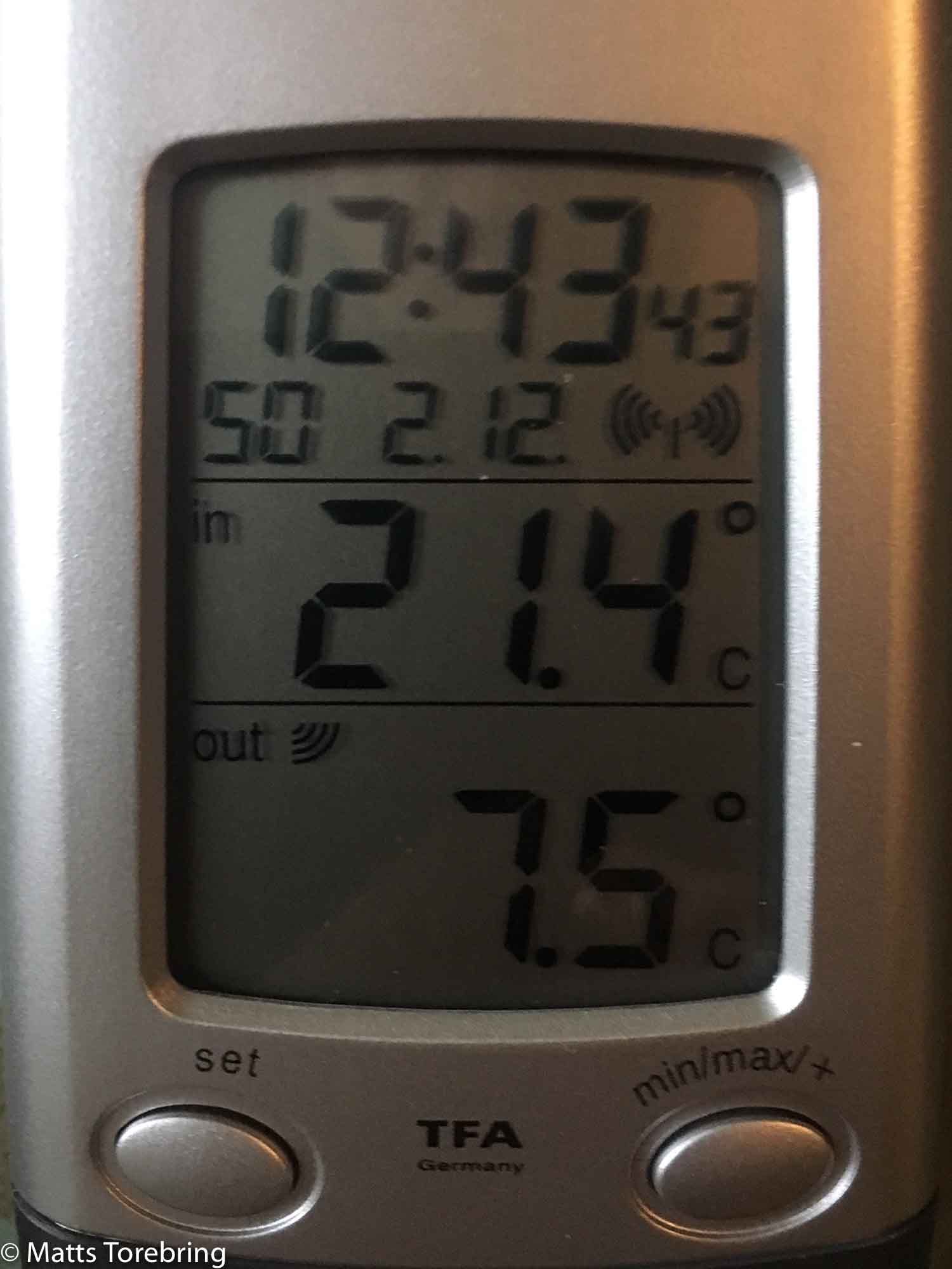 Jag har ställt in termostaten ute i bussen på plus 7 grader, samt på 2 kw el. När det blev minus 12 grader ute, sjönk tempen i bussen en halv grad (0,5). Just nu har vi plus 5 grader ute och då visar tempen inne i bussen plus 7,5 grader. Detta tycker jag är helt imponerande! De flesta av er vet hur vi hade det innan, i den förra husbilen.