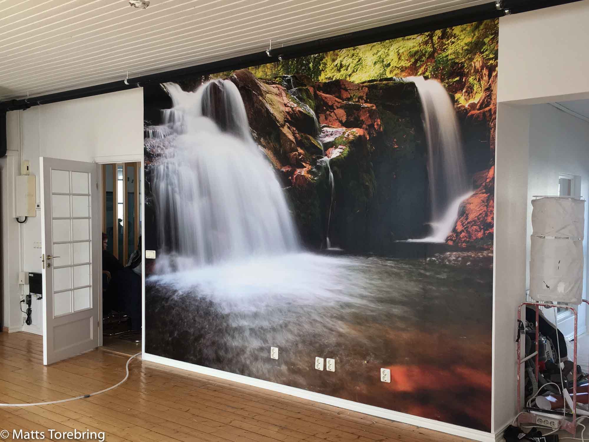 Nu är vi inne i gamla delen och rustar upp. Lasse Johansson, Jarls Måleri, tapetserar vidare. I dag kom de två sista fondväggarna på plats. Fondväggarna är ytterst noga utvalda, för att passa till mattan på golvet och maskinerna. Alla tre* fondväggarna är helt magiska, jag har beställt dem på nätet från, http://www.E-Tavlor.se. Jag skulle bara vilja veta, var dessa tre magiska bildern är tagna? (* plus domherren på kontoret)