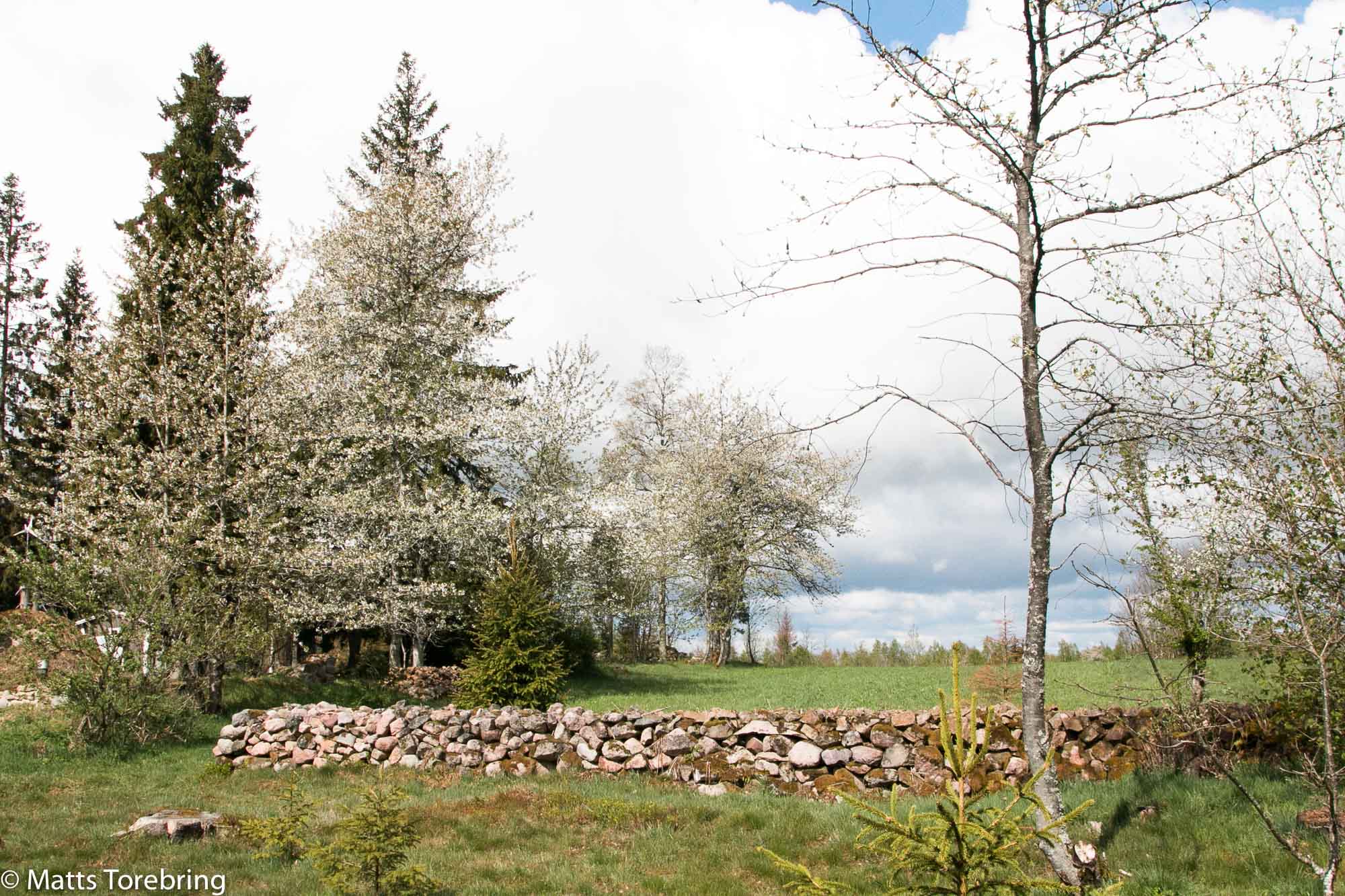 En riktig Smålandsidyll, blommande körsbärsträd och en stenmur. Detta var det enda som fanns av blommor, på vägen upp till Ljusboden.