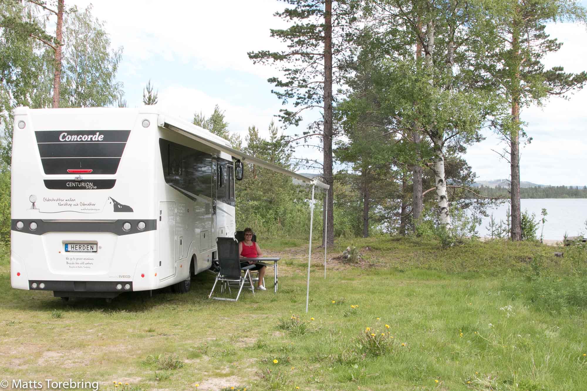 Här ryms säkert ett 50- tal fordon. Just nu är vi bara fyra. Så tyst, så vackert, bara tio meter till bad. Så här vill vi bo om vi får! Pris 150.- per natt. 700:- för en hel vecka. Betala smidigt med swich.