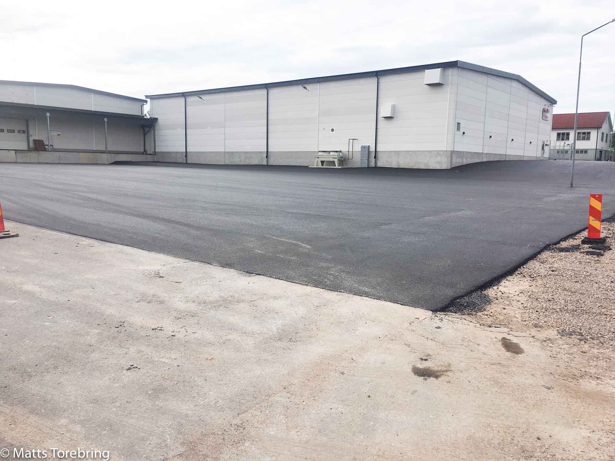 Här kommer många tradare att rymmas samtidigt. Vi har faktiskt fått riva ned hela fem hus, för att ge plats till detta. Om varje lastbil lastar 8 m3, har det gått åt 21 lastbilar med asfalt. Här har vi lagt 8 cm, på övriga delar 5 cm.