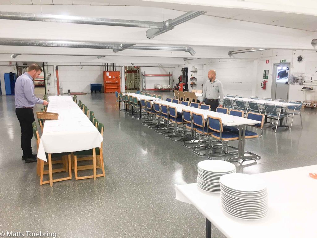Idag skulle vi duka upp och göra klart. Personer som jag förlitade mig på att ha till hjälp, blev plötsligt sjuka hela veckan. Jag mejlade ut och bad om hjälp. Visst fick jag hjälp. Att få fram bord och stolar, för ett 75- tal gäster går inte av sig själv. Dessutom glas till välkomstdrink, glas till maten, porslin, bestick. dukar och servetter. Packshop är så stort, att vi skulle kunna ta in ett par hundra gäster. Eskilssons Mat & Catering står för grillbuffén.