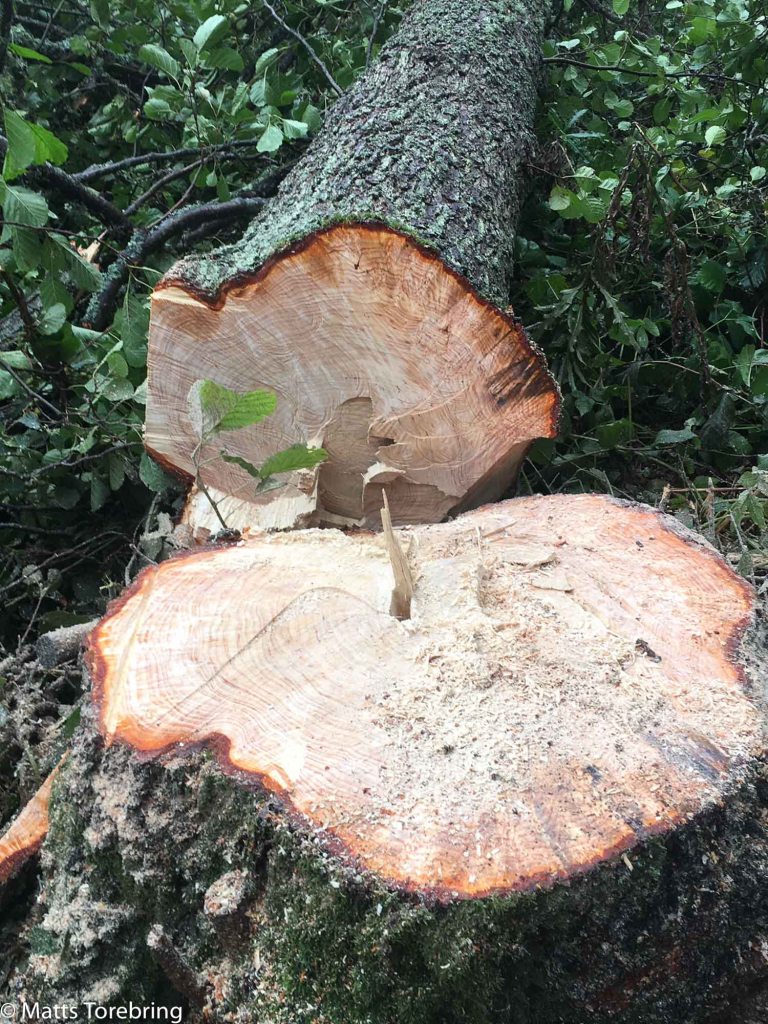 Jag fällde på en björk i medelklass storlek, men inget hände, trots att björken hängde kvar. Jag tog till en annan ganska stor Al och fällde mot trädet, båda träden kanade ned, men inget hände. (Säkert förbjudet att göra så) Jag ringde Jonas, min ständige grävmaskinist, men han var redan hemma för dagen. Jag ville inte heller lämna trädet kvar. Jag fortsatte att såga ur kilar och till slut föll det till marken. Vad skönt!
