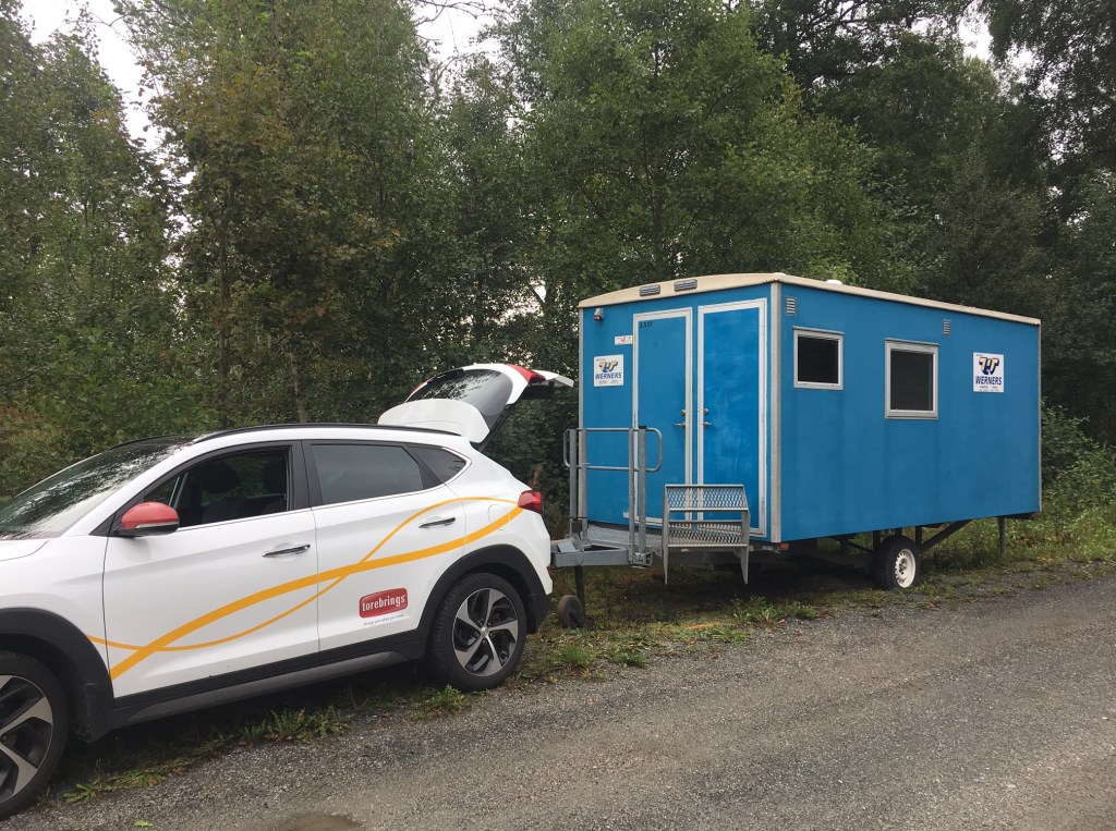 Det är riktigt tuff mark att arbeta i. Vegetationen är tät och meterhög, blandat med sly och grenar, som gör att man snubblar omkull och far hit och dit. Två kvällar till, så är jag klar eller kanske några timmar på lördag. I kväll kunde jag byta om i min byggarbod och åka hem i vitt skjorta. Det var skönt!
