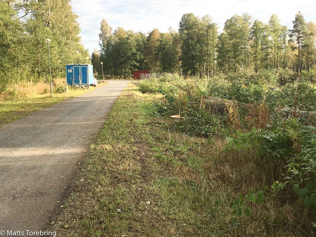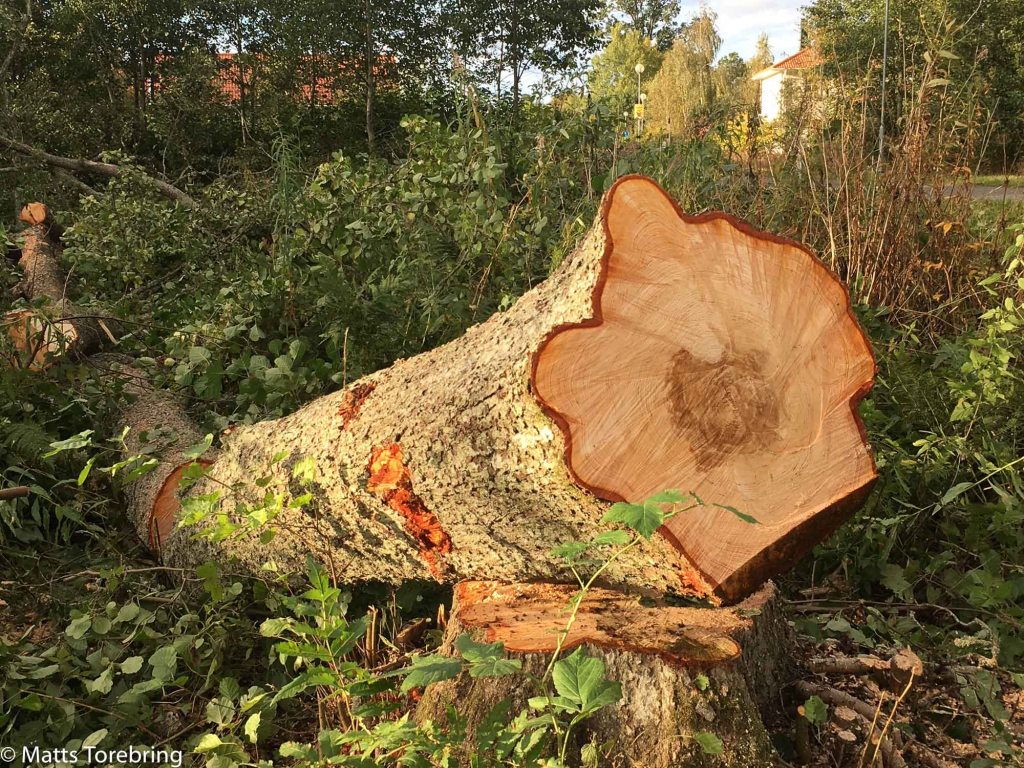 Jag hade kvar fyra ganska stora träd utefter gatan, som jag hade respekt för. De lutade åt fel håll, vägen gick nära, bilen och min arbetsbod stod nära. Dessutom är det röta i kärnan på många träd och då kan trädet brytas av och falla var som helst. Då kom Jonas Karlsson med sin grävmaskin och puttade på.