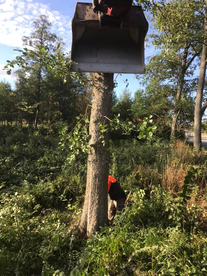 Jag hade kvar fyra ganska stora träd utefter gatan, som jag hade respekt för. De lutade åt fel håll, vägen gick nära, bilen och min arbetsbod stod nära. Dessutom är det röta i kärnan på många träd och då kan trädet brytas av och falla var som helst. Då kom Jonas Karlsson med sin grävmaskin och puttade på.