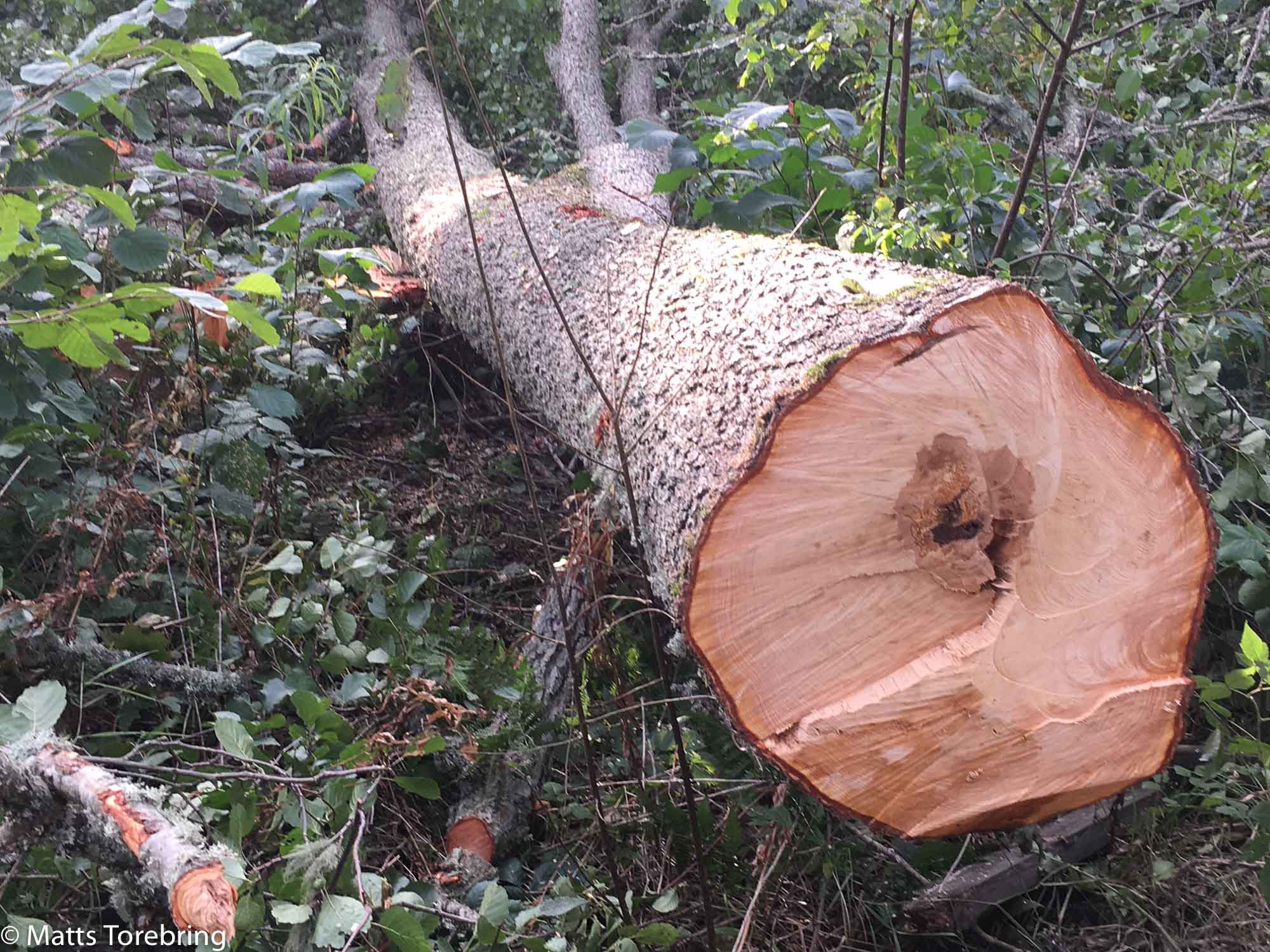 Klockan drog iväg, bensinen tog slut i motorsågen och Matts var trött. Jag stannade helt enkelt utan att göra helt klart. Nu har jag bara en stor björk kvar och några mindre alar kvar att fälla. Det blir så enormt mycket stockar, att jag tvivlar på att det ryms på ett hel lastbil med släp.