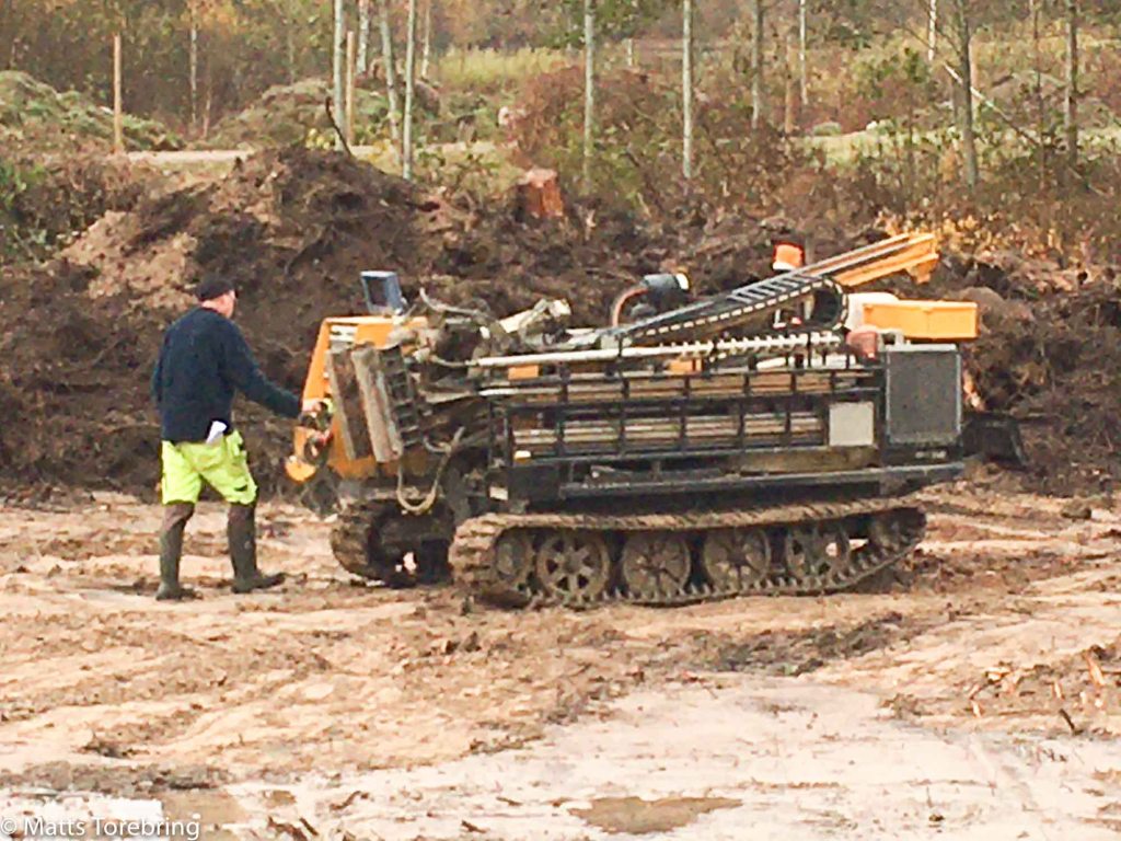 Jag tittade till borrningen ett par gånger under dagen. Det finns kvar ett ytskikt av lera, sedan 50 cm sand och sedan lera igen. Risken finns att vi måste påla innan vi kan gjuta grunden.