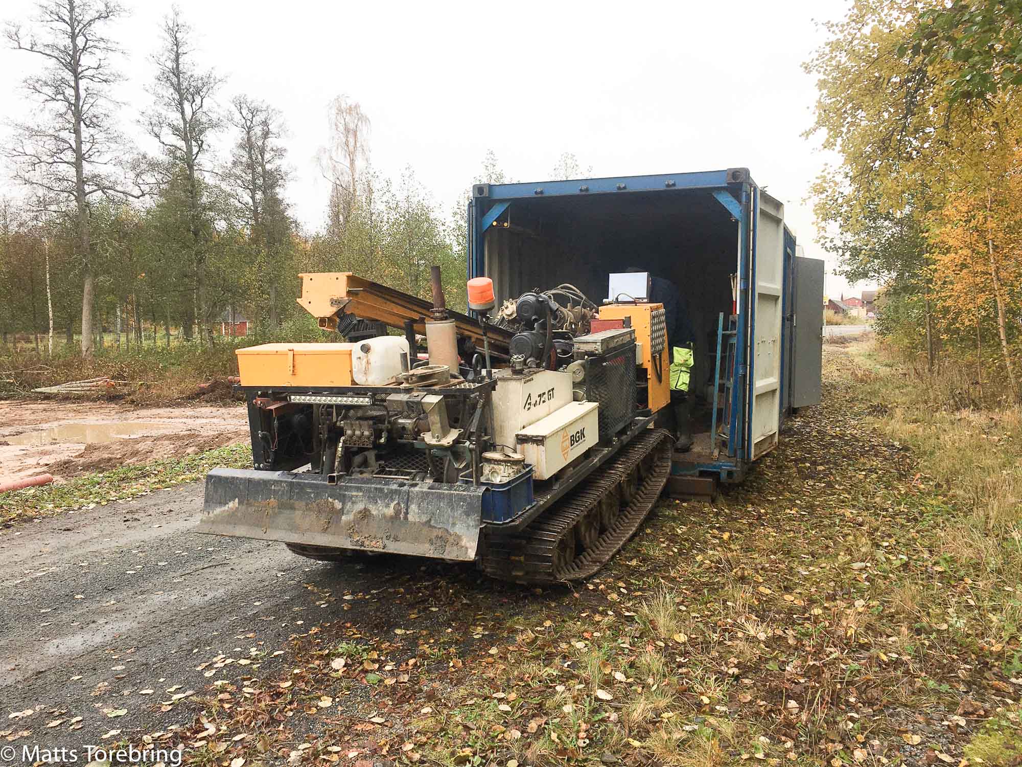 Jag tittade till borrningen ett par gånger under dagen. Det finns kvar ett ytskikt av lera, sedan 50 cm sand och sedan lera igen. Risken finns att vi måste påla innan vi kan gjuta grunden.