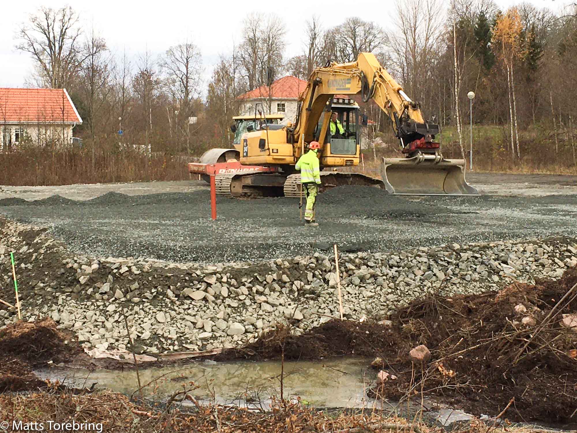 Så här såg det ut vid lunchtid idag, knappt tre dagar senare. Om vi inte behövt invänta svar från markmätningen, hade vi kunna börja lägga grunden i morgon. Vilken fart det blev på en enda gång.