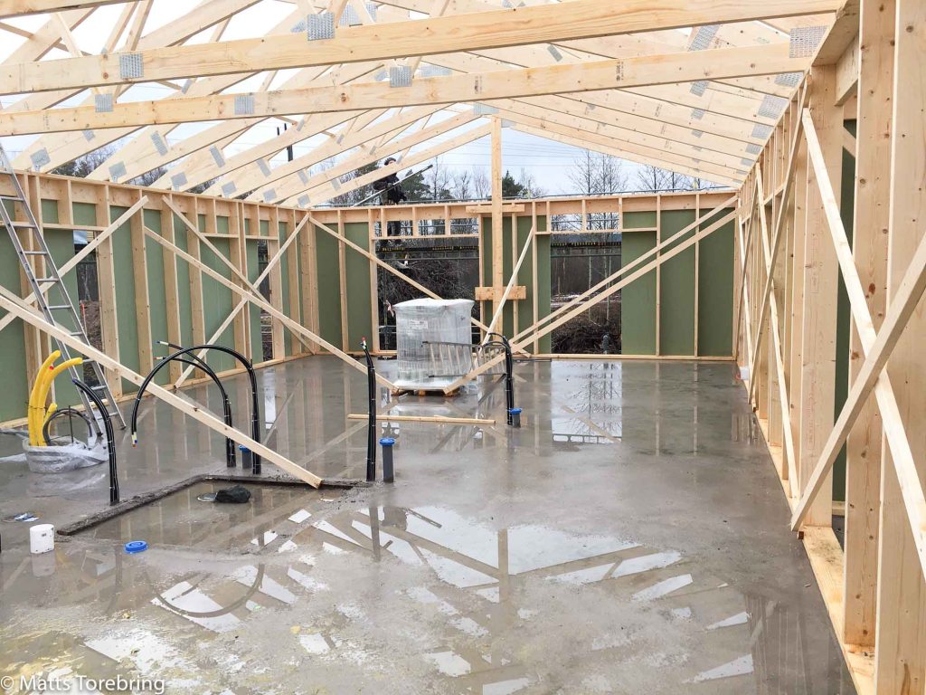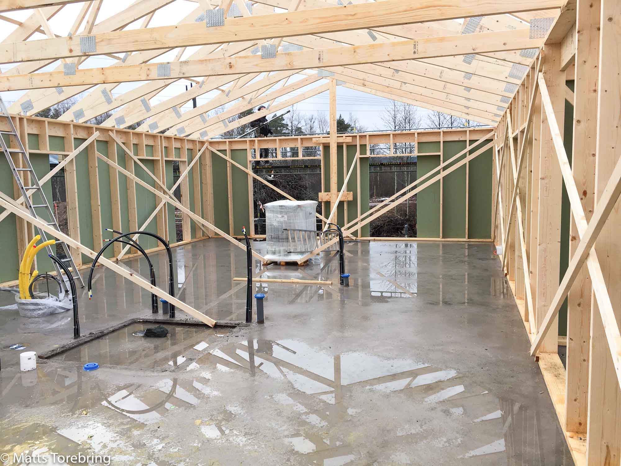 Här får vi hela 3,70 till tak. Köket kommer att byggas upp vid rören i golvet. Detta är ”Olidligt spännande”!