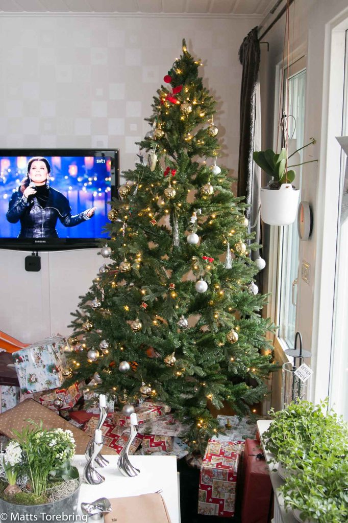 Familjen har köpt en färdigklädd gran med ljus i. Riktigt fin är den.
