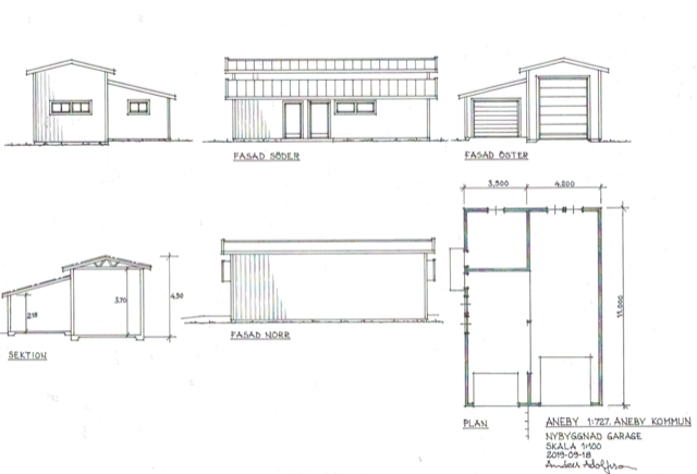 Så var det tisdag, helgerna är över och snickarna är tillbaka. En man monterade upp hängrännor och stuprör på huset och två man har börjat resa stommen till garagen. Men oj vad högt det kändes. Detta trots att golvet i garaget är nedsänkt 260. Lillbilen skall stå tillvänster i låga delen.