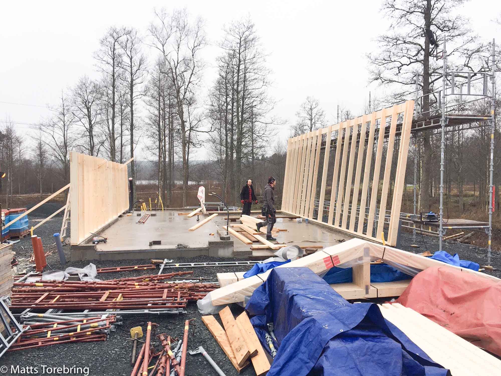 Väggarna till Bussen är 3900 höga. Porten till Herdestallet är 3800 hög och 3500 bred. I mitten av garagen läggs en limträbalk, den saknade snickarna vid lunch idag. Hoppas den kommer snabbt, så de kan ta upp takstolarna och täcka taket också. Nu är det spännande igen, det kommer att hända nya saker varje dag hoppas jag.