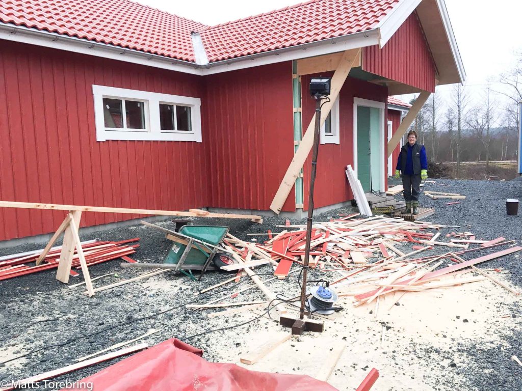 Så här mycket att städa, har det aldrig varit innan. Mängders mängder av små träbitar, från all måttanpassning av fasadpanel och läckt. Till slut fick jag lägga mig på knä och fylla flera sopsäckar med bara småpluttar. Idag fick jag hjälp av min Birgitta att städa, och sedan kom Linus & pappa Niklas också.