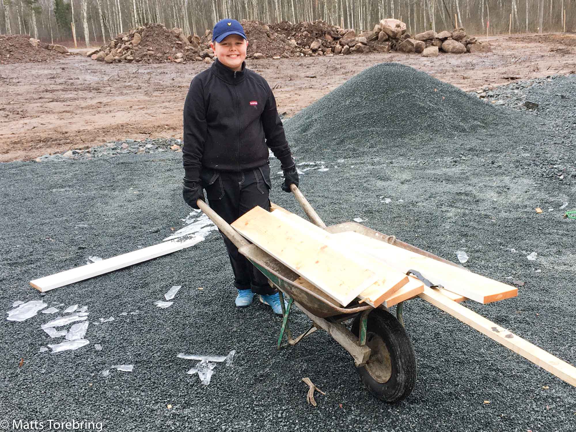 I går var det tacksamt att få hjälp, det var så mycket att städa undan, flytta undan virke och förarbeta för snickarna.