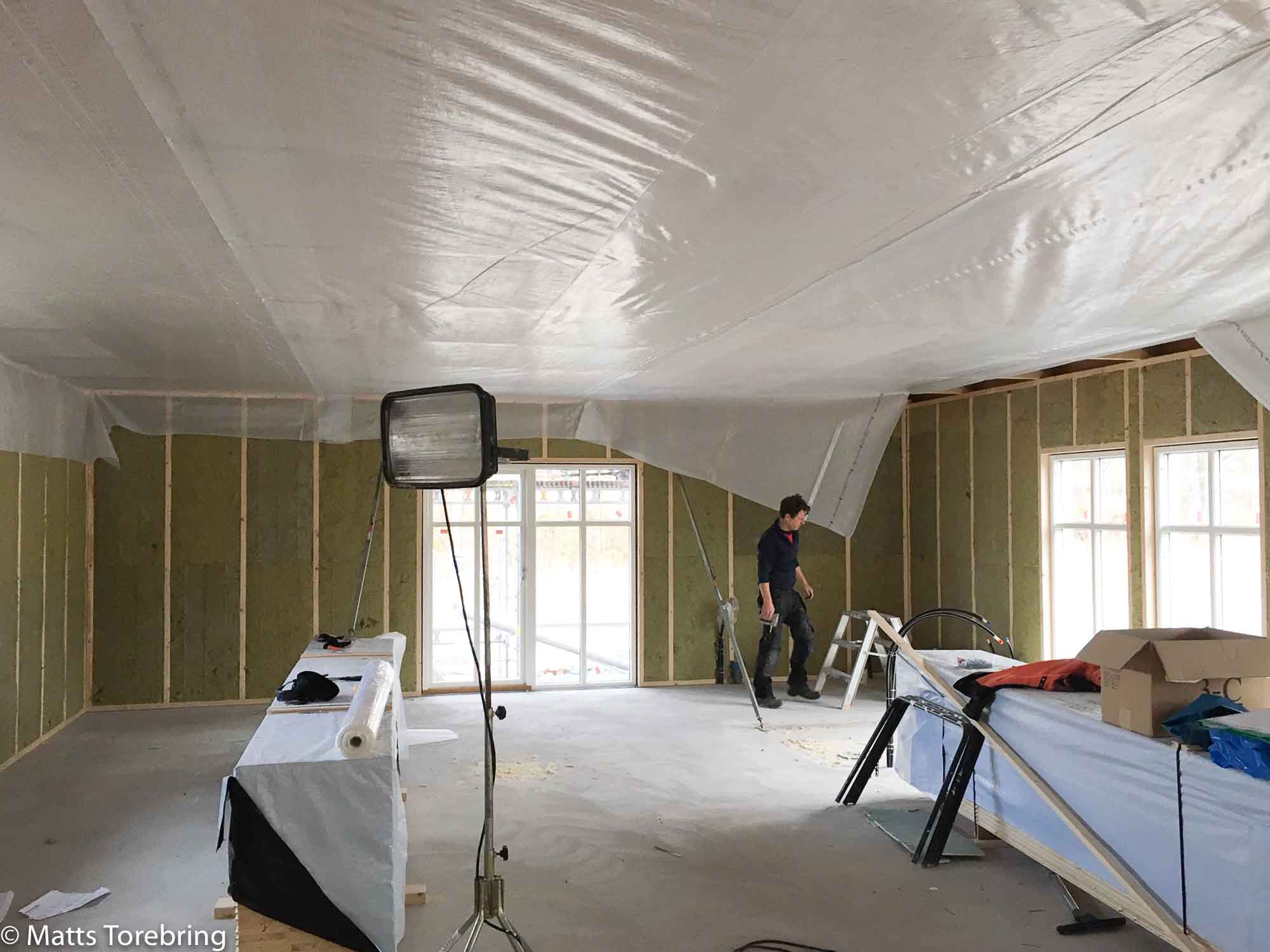 Bilden är från lunchrasten. I kväll var det sent och mörkt innan jag kom till bygget. Då hade glespanelen kommit upp i två sovrum. När glespanelen är uppe, kan elektrikerna börja sitt jobb. Nu väntar jag på installation av ventilation, uppe på vinden under veckan. Vid fönstren på gaveln har Birgitta och jag vårt sovrum. Vi får så lyxigt, att vi får en egen dusch och toalett, innanför vårt sovrum. (Första fönstret på höger sida) Våra gäster får också egen dusch och toalett.