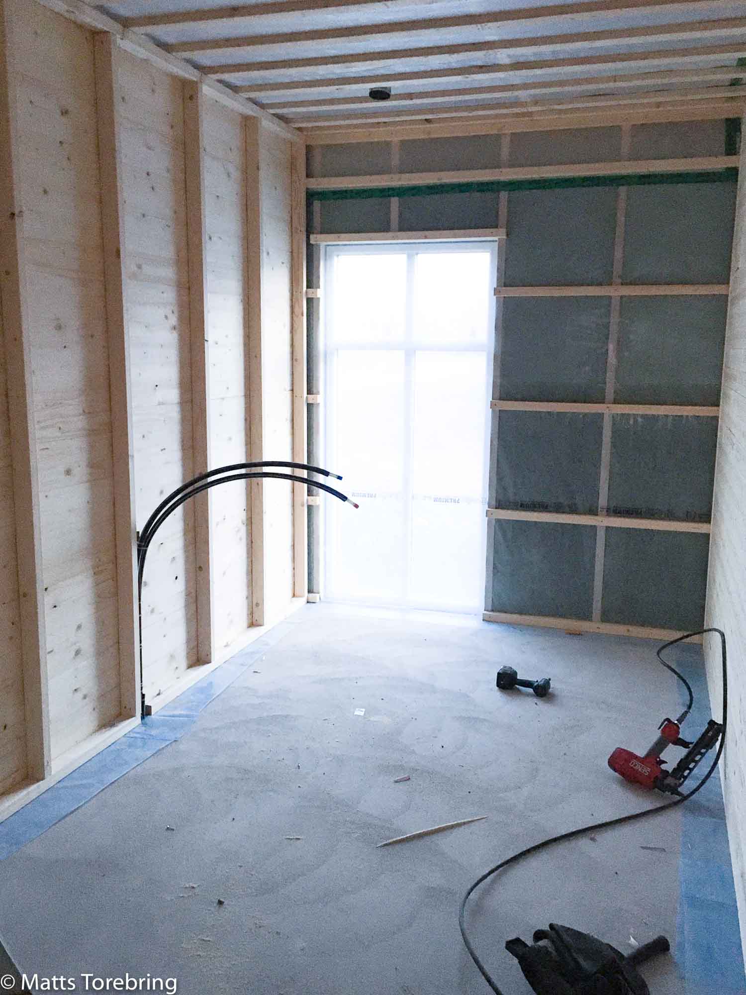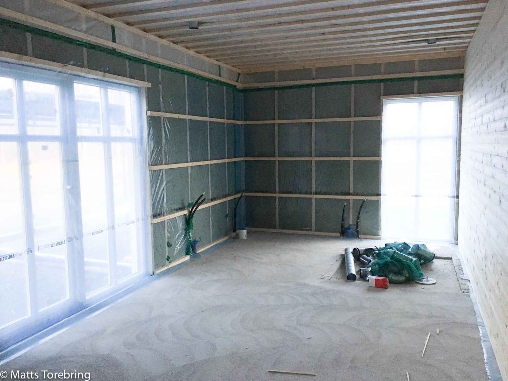 Utefter väggen till höger hade vi först planerat förvaring, men det tog vi bort. Vi ville inte ha en korridor i huset, utan att kunna umgås överallt. Här ska vi istället ha två sköna vilstolar. Kanske gå upp och sitta en stund på natten, eller att sitta och ljuga lite med gäster.