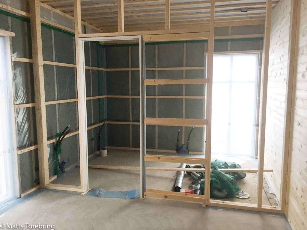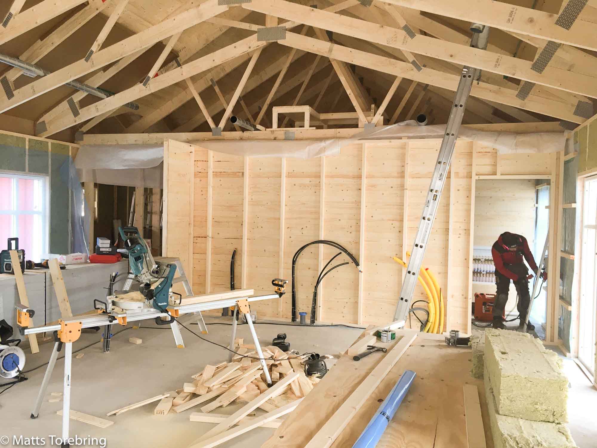 Alla innerväggar är uppe nu. En snickare står och jobbar i tvättstugan, i direkt anslutning till köket.