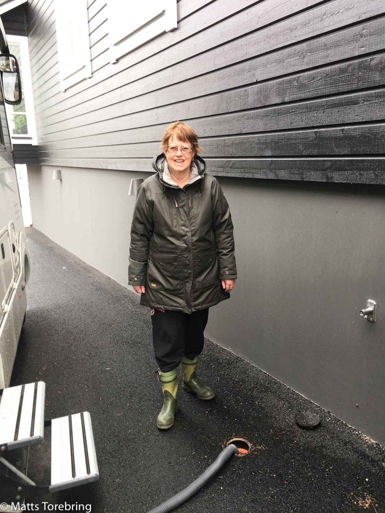 Nu har det gått fyra veckor igen och varningslampan för svartvattnet tänds, när jag tar upp stödbenen. Vi bara rullar ut utanför grinderna, fram till nya kontoret. Där har har vi den egna tömningen för svartvatten. Färskvatten har vi på väggen intill. Färskvatten har vi också nere på på gården där vi parkerat..