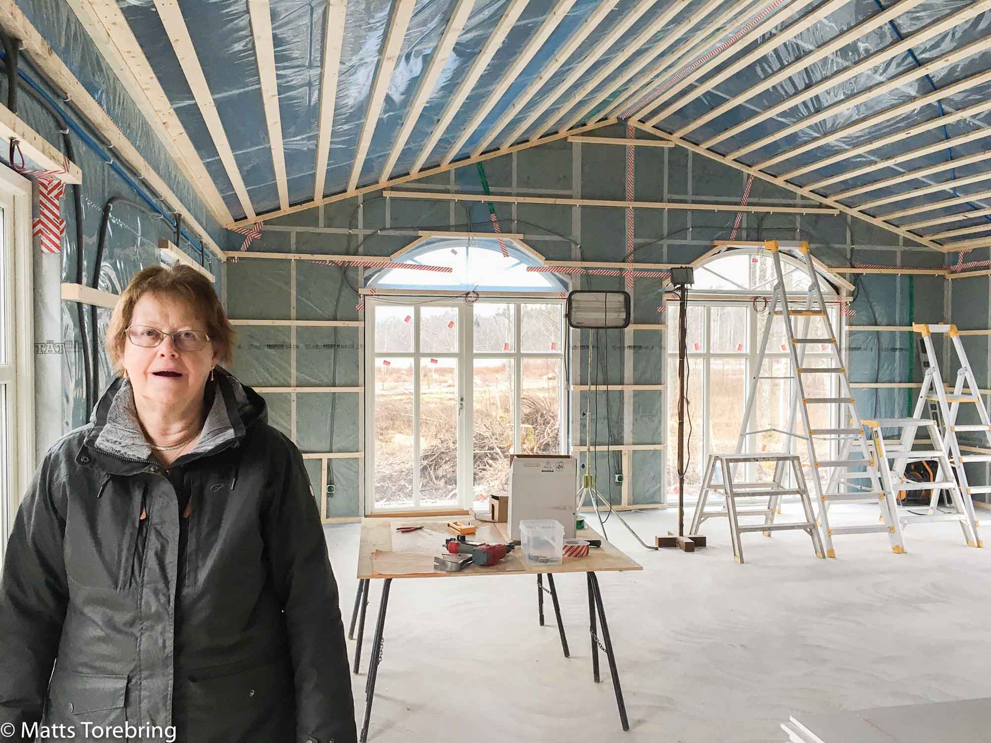 För första gången kom tanken idag, på tapeter på väggarna. Det är inte mycket väggar kvar att tapetsera, fönstren tar ut sin rätt. Vi är överens om, att det blir inget svårt val. En vit sandtapet, för att möta mot golvet.